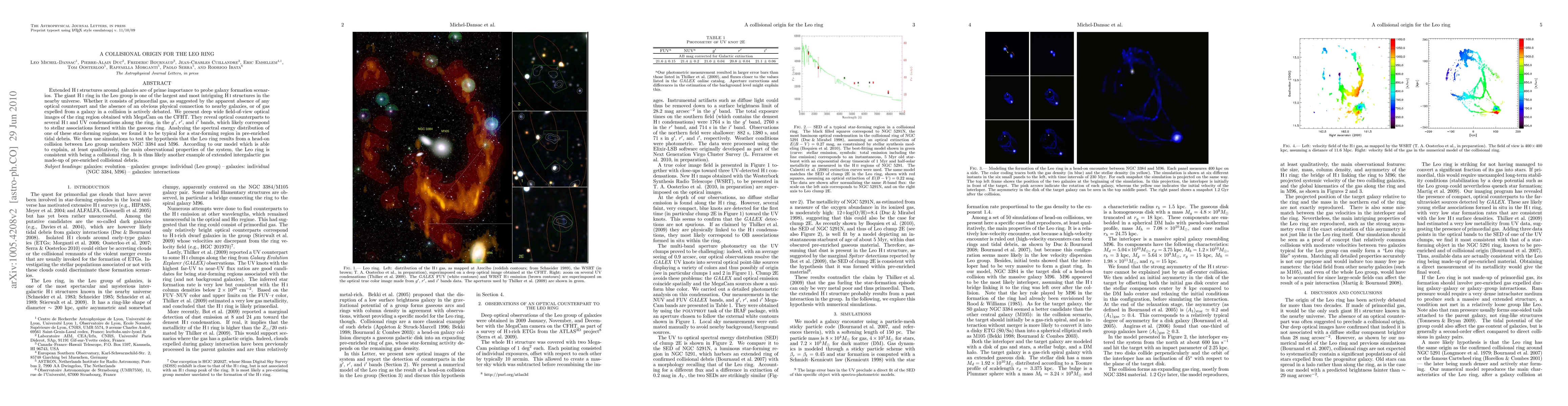 The Leo ring, a large HI structure in the Leo group, is likely formed from a collision between galaxies NGC 3384 and M96, as evidenced by optical counterparts to HI and UV condensations and spectral analysis supporting star formation in pre-enriched tidal debris. This suggests the ring is an example of extended intergalactic gas from a galactic collision.