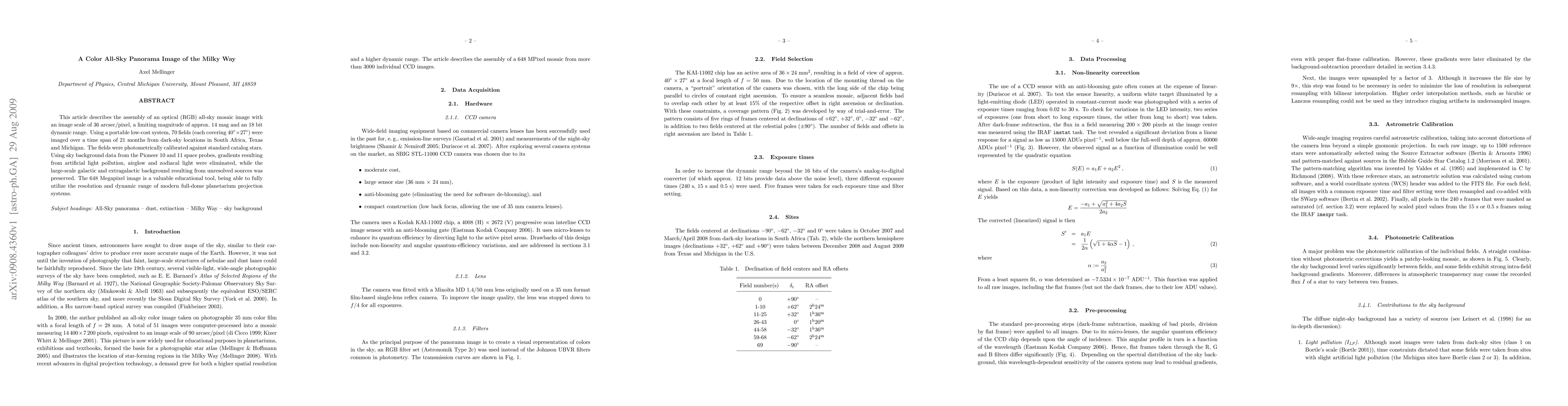 This article describes the assembly of an optical (RGB) all-sky mosaic image with an image scale of 36 arcsec/pixel, a limiting magnitude of approx. 14 mag and an 18 bit dynamic range. Using a portable low-cost system, 70 fields (each covering 40 deg x 27 deg) were imaged over a time span of 21 months from dark-sky locations in South Africa, Texas and Michigan. The fields were photometrically calibrated against standard catalog stars. Using sky background data from the Pioneer 10 and 11 space probes, gradients resulting from artificial light pollution, airglow and zodiacal light were eliminated, while the large-scale galactic and extragalactic background resulting from unresolved sources was preserved. The 648 Megapixel image is a valuable educational tool, being able to fully utilize the resolution and dynamic range of modern full-dome planetarium projection systems.