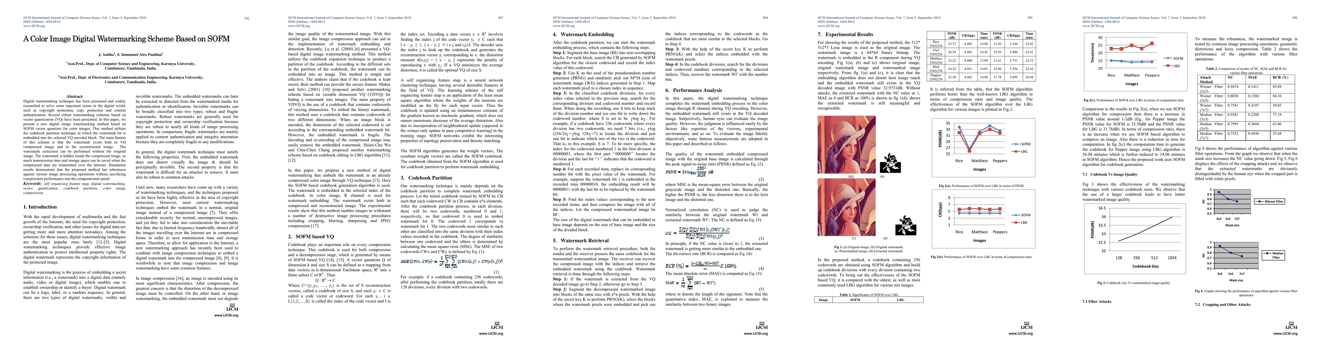This paper introduces a novel digital watermarking scheme for color images using a Self-Organizing Feature Map (SOFM) vector quantizer. The method embeds watermark bits in VQ encoded blocks, ensuring both robustness and preservation of the watermark in compressed and reconstructed images, with extraction possible without the original image. Simulation results show good performance in terms of robustness, compression, and computational speed.