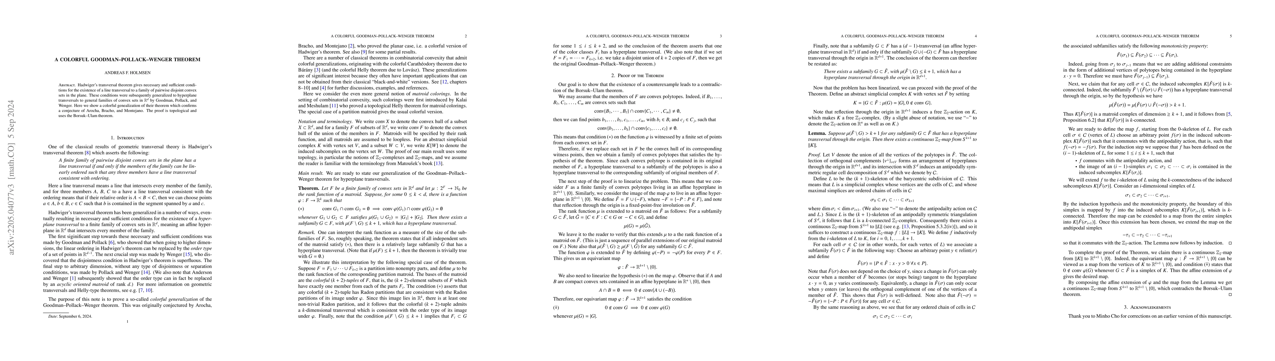 Researchers prove a colorful generalization of a theorem on transversals to convex sets in R^d, confirming a conjecture and using the Borsuk-Ulam theorem.