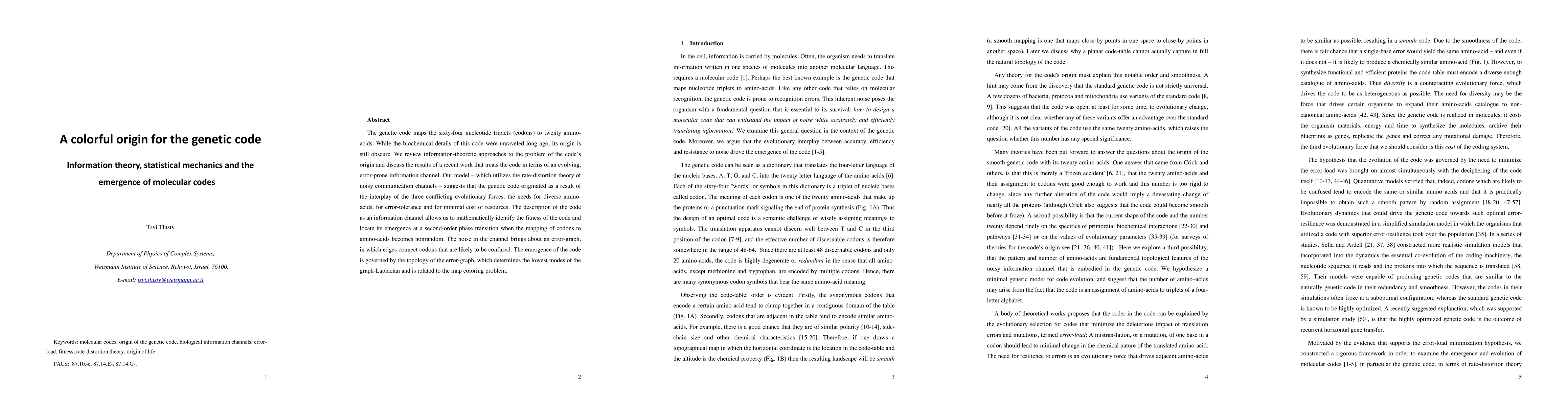 The genetic code maps the sixty-four nucleotide triplets (codons) to twenty amino-acids. While the biochemical details of this code were unraveled long ago, its origin is still obscure. We review information-theoretic approaches to the problem of the code's origin and discuss the results of a recent work that treats the code in terms of an evolving, error-prone information channel. Our model - which utilizes the rate-distortion theory of noisy communication channels - suggests that the genetic code originated as a result of the interplay of the three conflicting evolutionary forces: the needs for diverse amino-acids, for error-tolerance and for minimal cost of resources. The description of the code as an information channel allows us to mathematically identify the fitness of the code and locate its emergence at a second-order phase transition when the mapping of codons to amino-acids becomes nonrandom. The noise in the channel brings about an error-graph, in which edges connect codons that are likely to be confused. The emergence of the code is governed by the topology of the error-graph, which determines the lowest modes of the graph-Laplacian and is related to the map coloring problem.