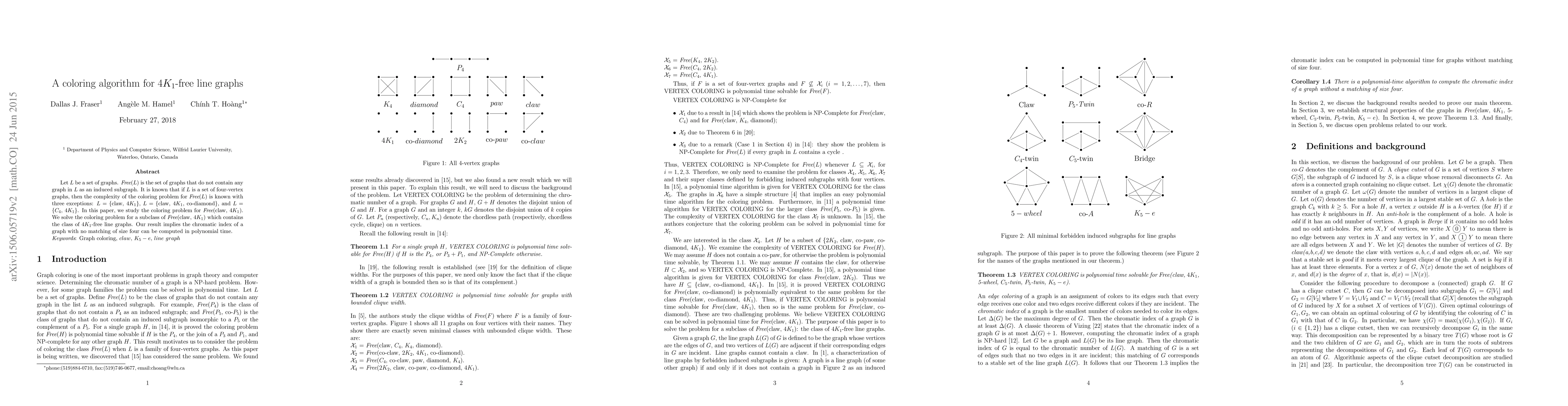 This paper addresses the coloring problem for $Free$(claw, $4K_1$), focusing on $4K_1$-free line graphs. It provides a polynomial-time algorithm for determining the chromatic index of such graphs, resolving an open complexity issue.