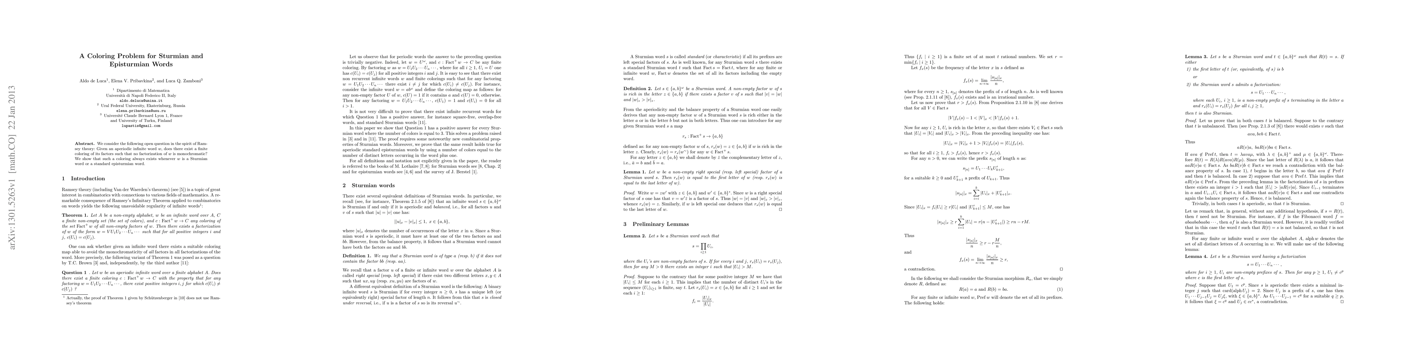 The paper presents detailed proofs and constructions for a coloring problem specific to Sturmian and standard episturmian words, advancing the theoretical framework in combinatorics on words.