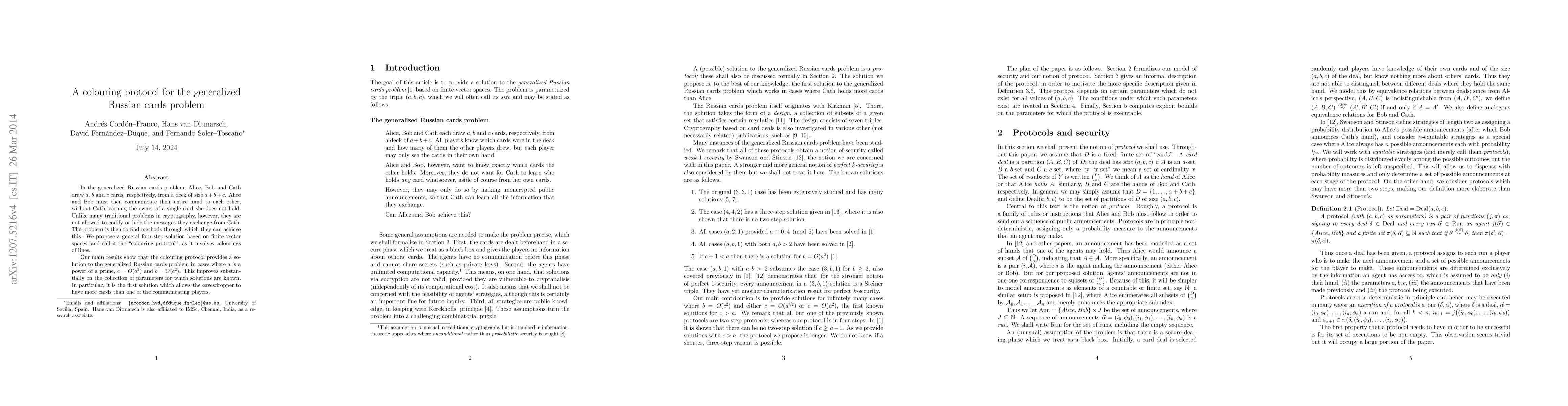 The paper proposes a "colouring protocol" to solve the generalized Russian cards problem, allowing Alice and Bob to communicate card ownership without revealing details to eavesdropper Cath, using finite vector spaces and colourings of lines. The protocol improves known solutions by extending applicability to cases where the eavesdropper has more cards than one player.