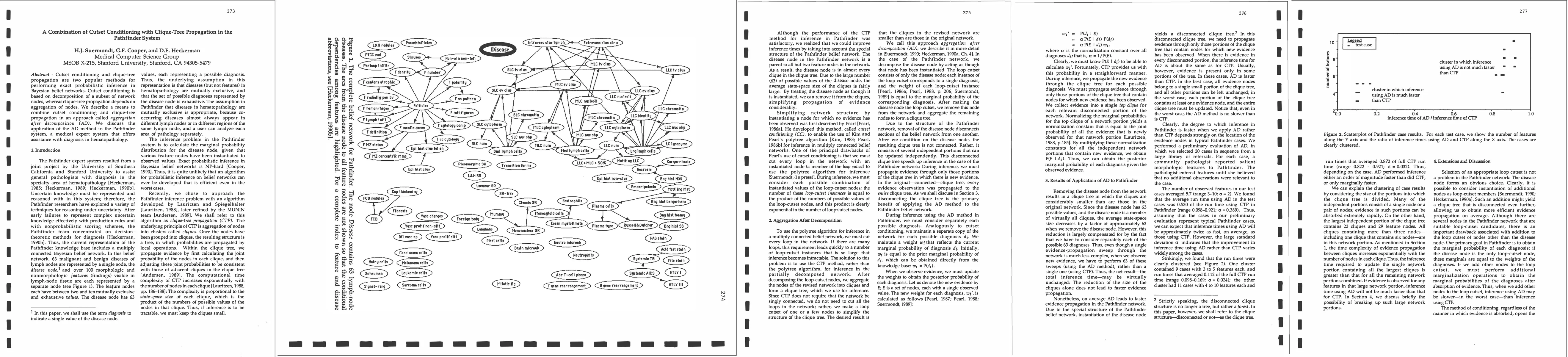 This paper proposes a novel method called aggregation after decomposition (AD) that combines cutset conditioning and clique-tree propagation for exact probabilistic inference in Bayesian belief networks. The AD method is applied within the Pathfinder system to assist with diagnosis in hematopathology.