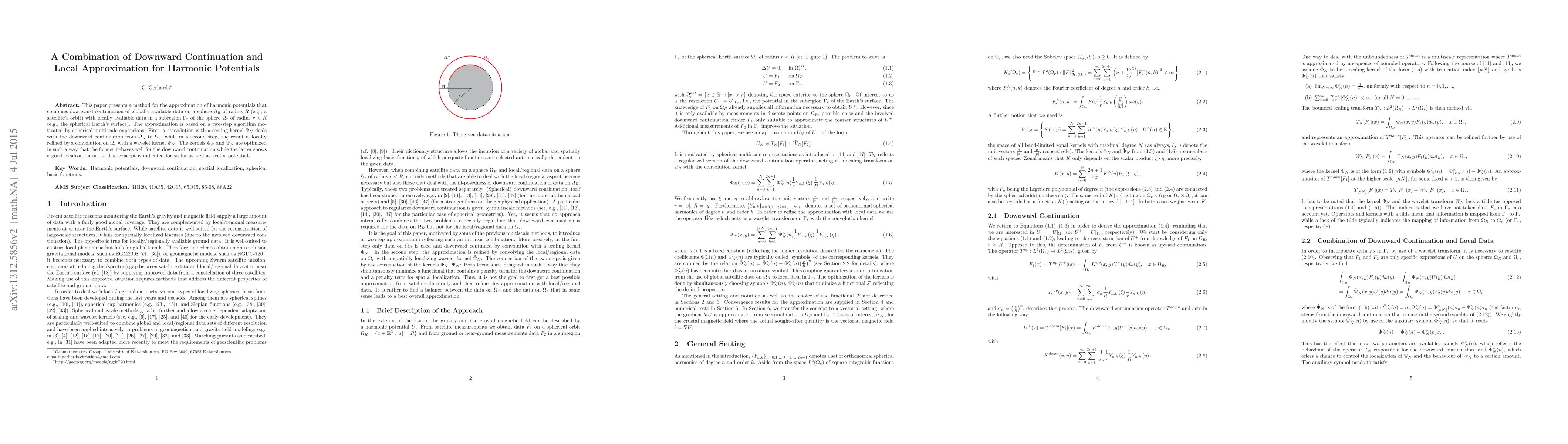 This paper proposes a method combining downward continuation and local approximation for harmonic potentials, using a two-step algorithm that optimizes kernels for effective data transition from global to local scales, suitable for both scalar and vector potentials. The approach aims to balance downward continuation efficiency with local data refinement.
