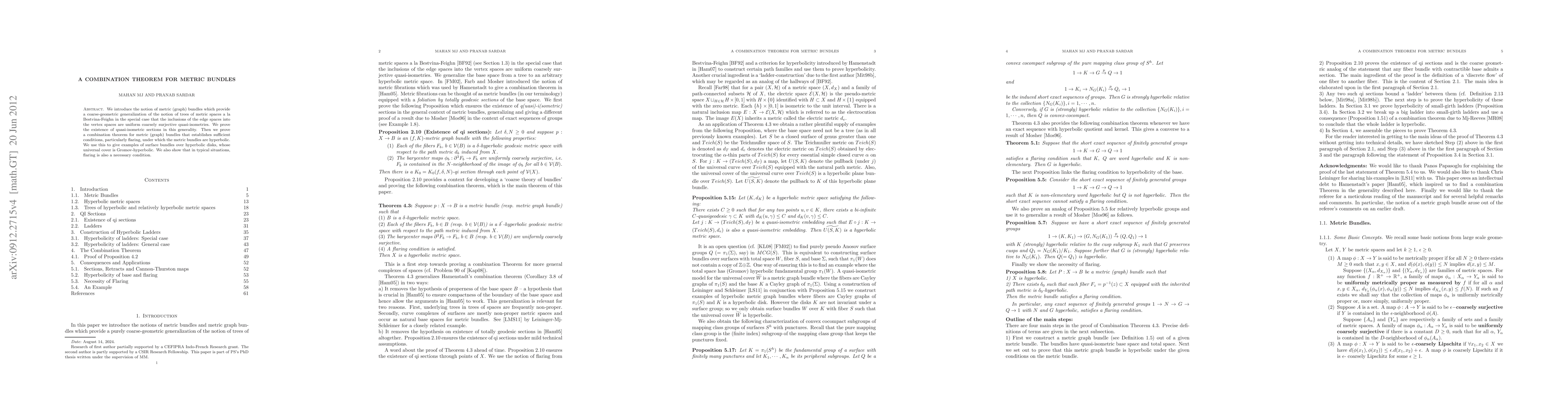 This paper introduces metric bundles, a topological generalization of trees of metric spaces, and proves the existence of quasi-isometric sections. It establishes a combination theorem for these bundles, showing that sufficient flaring conditions ensure hyperbolicity, and provides examples of hyperbolic surface bundles over hyperbolic disks.