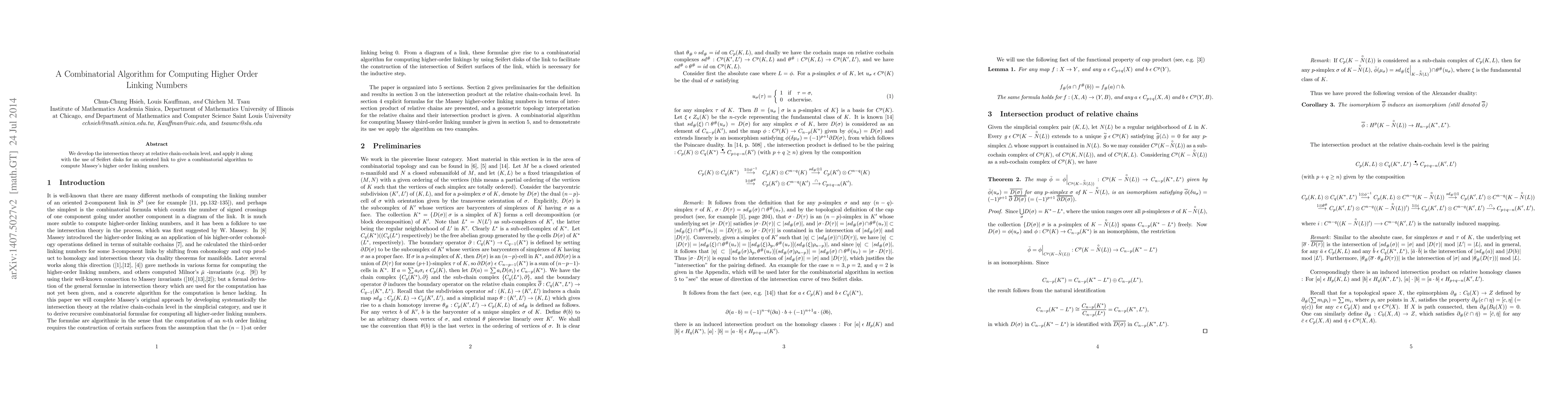 This paper presents a combinatorial algorithm for computing higher-order linking numbers using intersection theory at the relative chain-cochain level and Seifert disks. It systematically develops the necessary intersection theory and provides recursive formulae for the computation of these linking numbers.