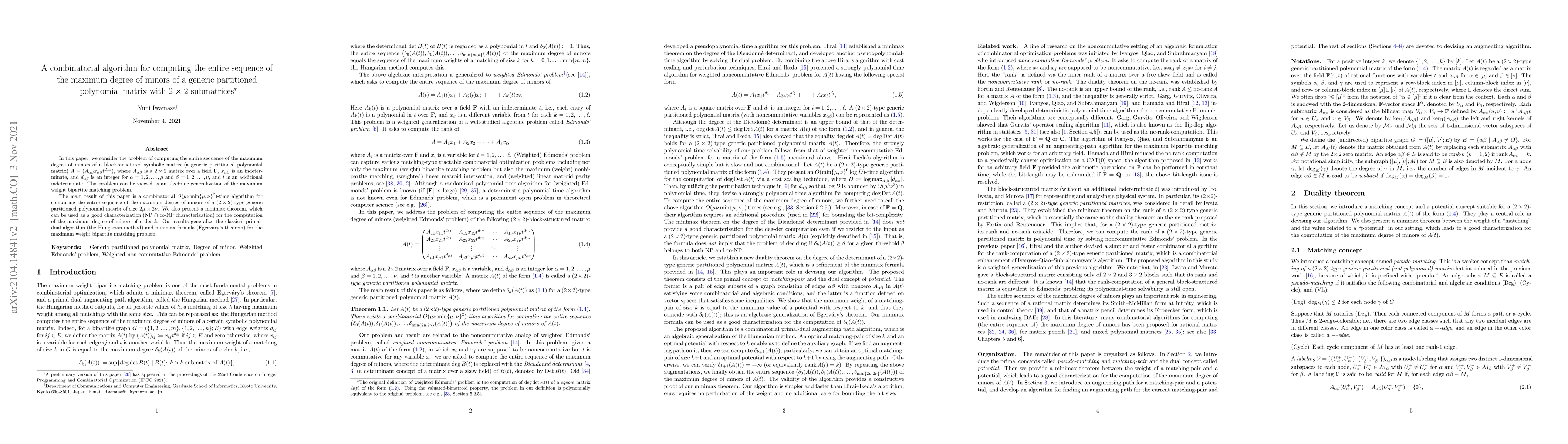 In this paper, we consider the problem of computing the entire sequence of the maximum degree of minors of a block-structured symbolic matrix (a generic partitioned polynomial matrix) $A = (A_{\alpha\beta} x_{\alpha \beta} t^{d_{\alpha \beta}})$, where $A_{\alpha\beta}$ is a $2 \times 2$ matrix over a field $\mathbf{F}$, $x_{\alpha \beta}$ is an indeterminate, and $d_{\alpha \beta}$ is an integer for $\alpha = 1,2,\dots, \mu$ and $\beta = 1,2,\dots,\nu$, and $t$ is an additional indeterminate. This problem can be viewed as an algebraic generalization of the maximum weight bipartite matching problem. The main result of this paper is a combinatorial $O(\mu \nu \min\{\mu, \nu\}^2)$-time algorithm for computing the entire sequence of the maximum degree of minors of a $(2 \times 2)$-type generic partitioned polynomial matrix of size $2\mu \times 2\nu$. We also present a minimax theorem, which can be used as a good characterization (NP $\cap$ co-NP characterization) for the computation of the maximum degree of minors of order $k$. Our results generalize the classical primal-dual algorithm (the Hungarian method) and minimax formula (Egerv\'ary's theorem) for the maximum weight bipartite matching problem.