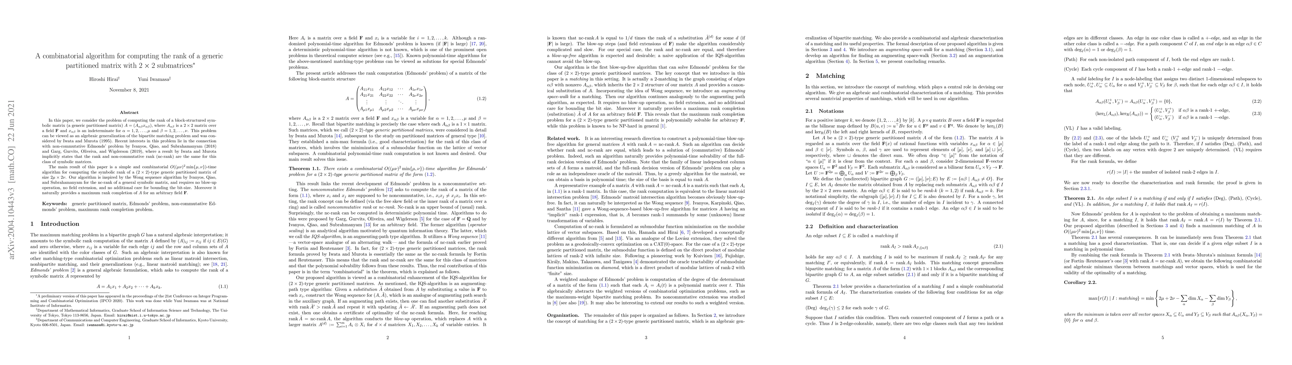 In this paper, we consider the problem of computing the rank of a block-structured symbolic matrix (a generic partitioned matrix) $A = (A_{\alpha \beta} x_{\alpha \beta})$, where $A_{\alpha \beta}$ is a $2 \times 2$ matrix over a field $\mathbf{F}$ and $x_{\alpha \beta}$ is an indeterminate for $\alpha = 1,2,\dots, \mu$ and $\beta = 1,2, \dots, \nu$. This problem can be viewed as an algebraic generalization of the bipartite matching problem and was considered by Iwata and Murota (1995). Recent interests in this problem lie in the connection with non-commutative Edmonds' problem by Ivanyos, Qiao, and Subrahamanyam (2018) and Garg, Gurvits, Oliveiva, and Wigderson (2019), where a result by Iwata and Murota implicitly states that the rank and non-commutative rank (nc-rank) are the same for this class of symbolic matrices. The main result of this paper is a simple and combinatorial $O((\mu \nu)^2 \min \{ \mu, \nu \})$-time algorithm for computing the symbolic rank of a $(2 \times 2)$-type generic partitioned matrix of size $2\mu \times 2\nu$. Our algorithm is inspired by the Wong sequence algorithm by Ivanyos, Qiao, and Subrahamanyam for the nc-rank of a general symbolic matrix, and requires no blow-up operation, no field extension, and no additional care for bounding the bit-size. Moreover it naturally provides a maximum rank completion of $A$ for an arbitrary field $\mathbf{F}$.