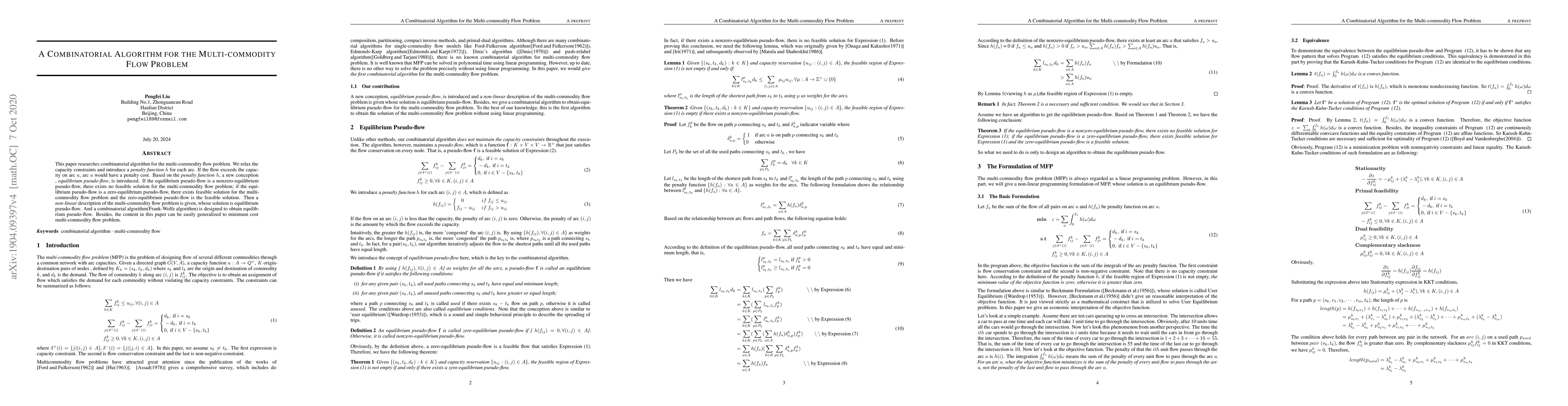 This paper proposes a combinatorial algorithm for solving the multi-commodity flow problem by relaxing capacity constraints and introducing a penalty function. It introduces equilibrium pseudo-flow and presents a method for determining the feasibility of a solution.