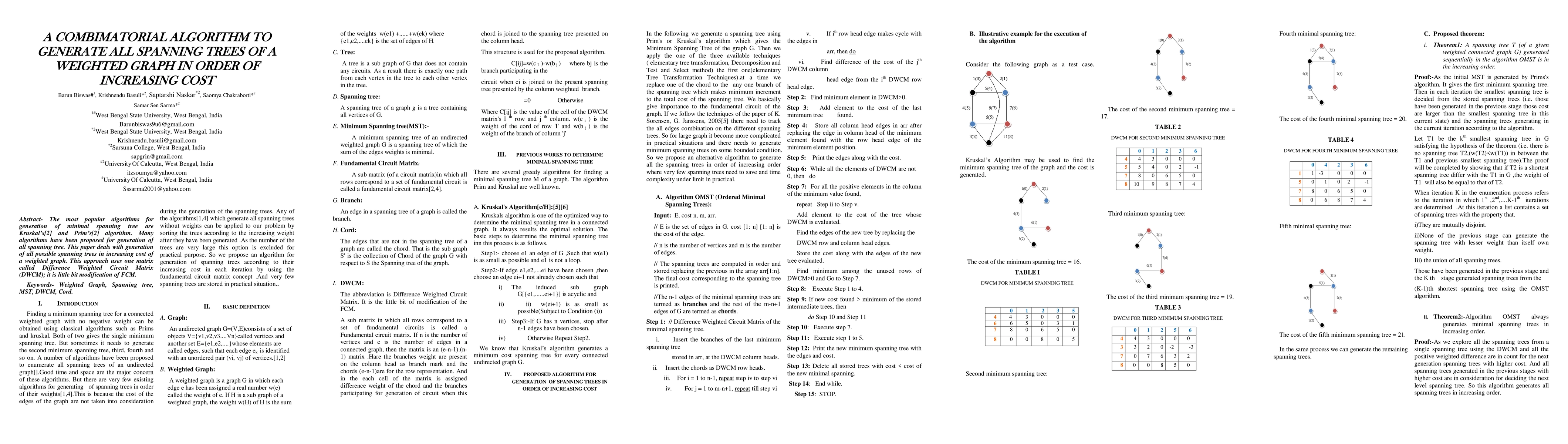 This paper proposes a combinatorial algorithm to generate all spanning trees of a weighted graph in order of increasing cost, utilizing a modified Difference Weighted Circuit Matrix for efficient enumeration. The approach aims to extend beyond minimal spanning trees to cover all possible spanning trees.