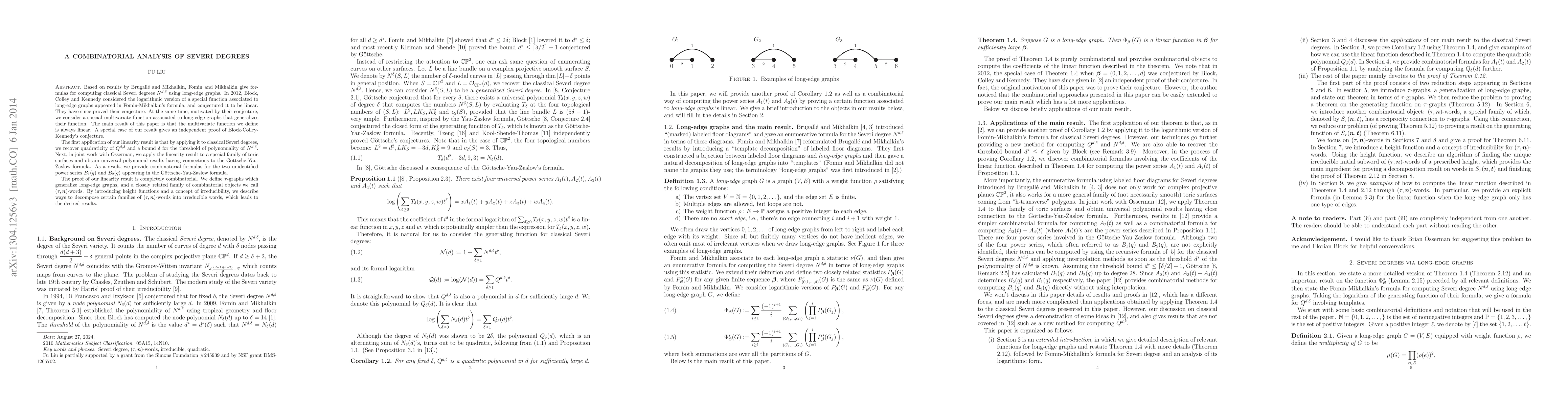 Based on results by Brugall\'e and Mikhalkin, Fomin and Mikhalkin give formulas for computing classical Severi degrees $N^{d, \delta}$ using long-edge graphs. In 2012, Block, Colley and Kennedy considered the logarithmic version of a special function associated to long-edge graphs appeared in Fomin-Mikhalkin's formula, and conjectured it to be linear. They have since proved their conjecture. At the same time, motivated by their conjecture, we consider a special multivariate function associated to long-edge graphs that generalizes their function. The main result of this paper is that the multivariate function we define is always linear. A special case of our result gives an independent proof of Block-Colley-Kennedy's conjecture. The first application of our linearity result is that by applying it to classical Severi degrees, we recover quadraticity of $Q^{d, \delta}$ and a bound $\delta$ for the threshold of polynomiality of $N^{d, \delta}.$ Next, in joint work with Osserman, we apply the linearity result to a special family of toric surfaces and obtain universal polynomial results having connections to the G\"ottsche-Yau-Zaslow formula. As a result, we provide combinatorial formulas for the two unidentified power series $B_1(q)$ and $B_2(q)$ appearing in the G\"ottsche-Yau-Zaslow formula. The proof of our linearity result is completely combinatorial. We define $\tau$-graphs which generalize long-edge graphs, and a closely related family of combinatorial objects we call $(\tau, n)$-words. By introducing height functions and a concept of irreducibility, we describe ways to decompose certain families of $(\tau, n)$-words into irreducible words, which leads to the desired results.