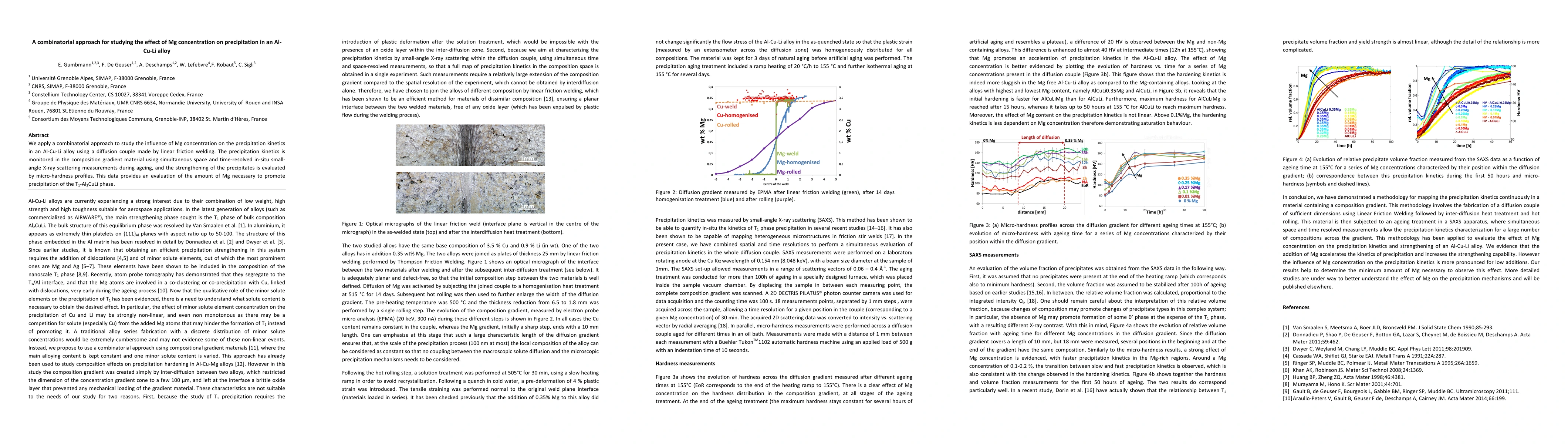 This paper uses a combinatorial approach and in-situ small-angle X-ray scattering to study how varying Mg concentrations affect precipitation kinetics in an Al-Cu-Li alloy. Micro-hardness profiles are used to evaluate the strengthening of precipitates, providing insights into the optimal Mg concentration for T1-phase precipitation.