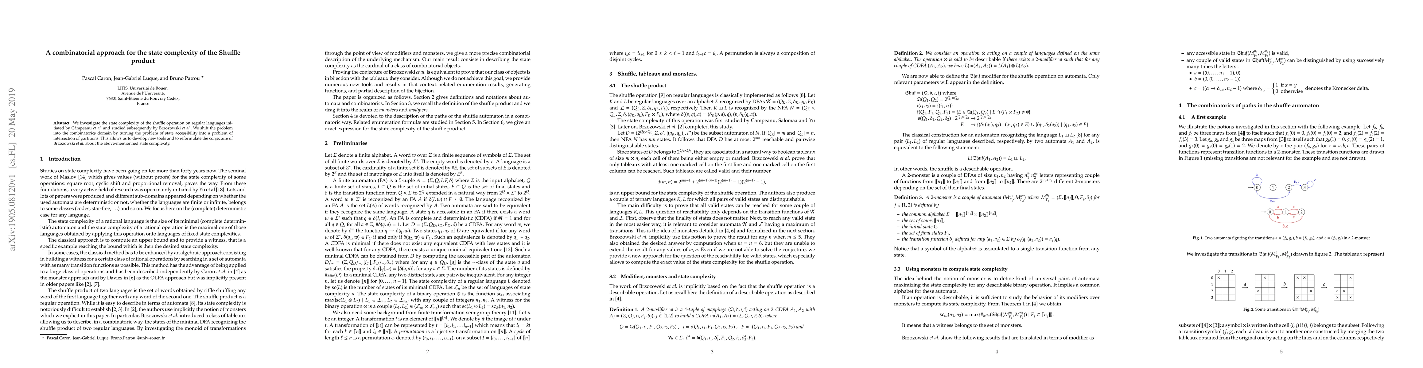 This paper explores the state complexity of the shuffle product on regular languages through a combinatorial approach, transforming state accessibility into partition intersection problems, leading to new tools and a reformulation of Brzozowski et al.'s conjecture on the topic.
