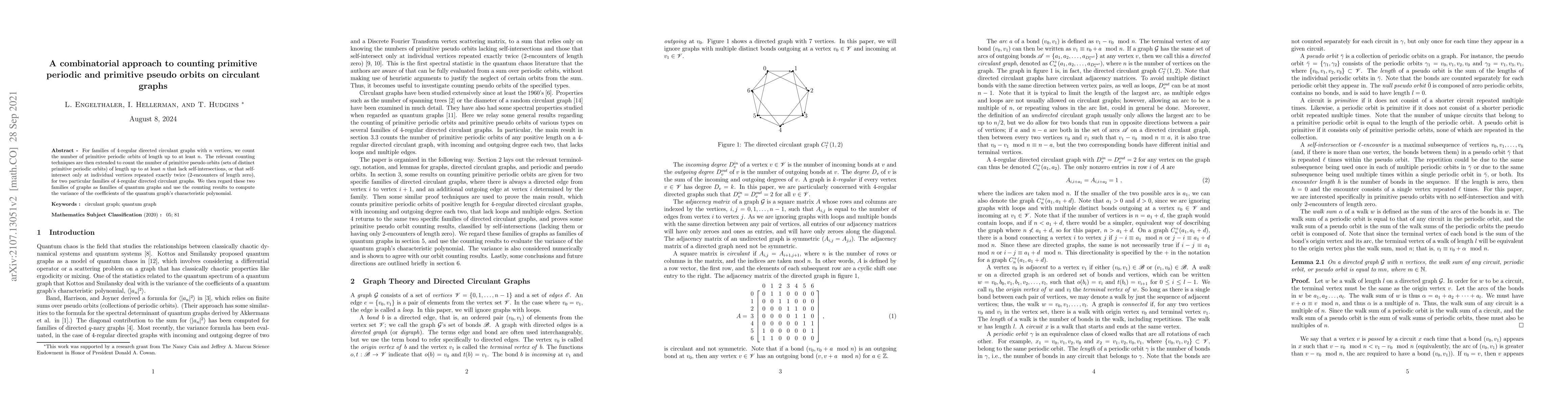 This paper develops a combinatorial method to count primitive periodic and pseudo orbits in 4-regular directed circulant graphs, extending the count to include non-intersecting and minimally intersecting orbits. It applies these counting techniques to compute the variance of coefficients in the characteristic polynomial of associated quantum graphs.