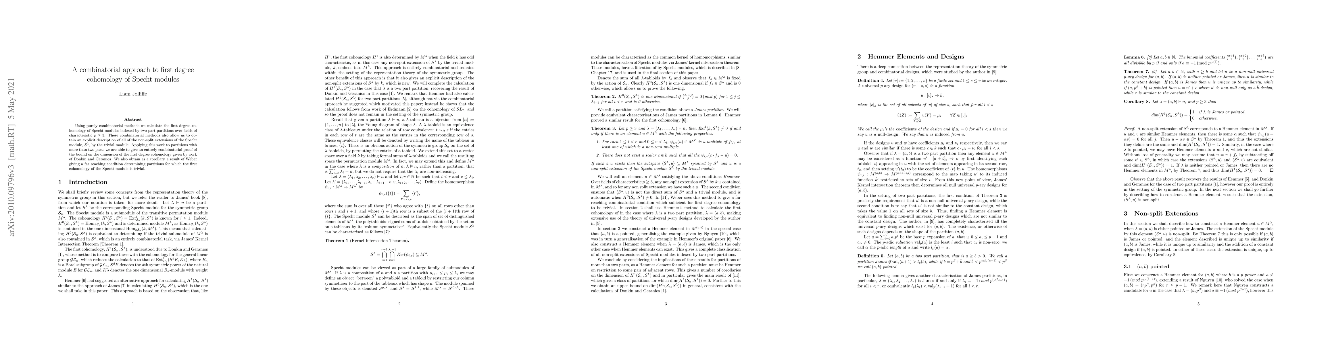This paper employs combinatorial techniques to determine the first degree cohomology of Specht modules for two-part partitions over fields of characteristic $p \ge 3$, providing an explicit description of non-split extensions and proving bounds on the cohomology dimension.