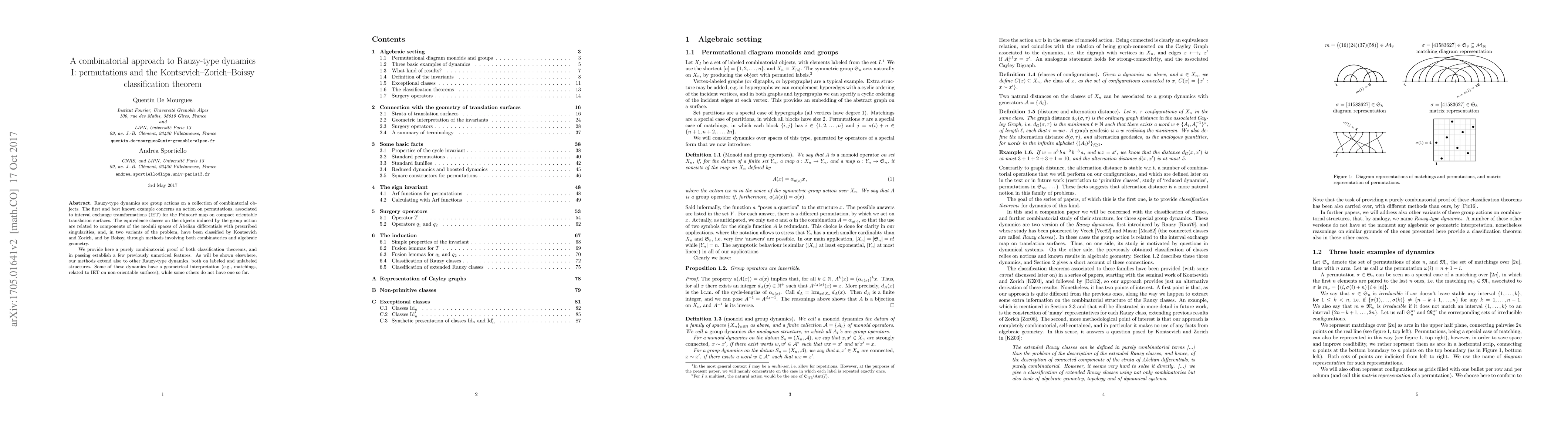 Rauzy-type dynamics are group actions on a collection of combinatorial objects. The first and best known example concerns an action on permutations, associated to interval exchange transformations (IET) for the Poincar\'e map on compact orientable translation surfaces. The equivalence classes on the objects induced by the group action are related to components of the moduli spaces of Abelian differentials with prescribed singularities, and, in two variants of the problem, have been classified by Kontsevich and Zorich, and by Boissy, through methods involving both combinatorics and algebraic geometry. We provide here a purely combinatorial proof of both classification theorems, and in passing establish a few previously unnoticed features. As will be shown elsewhere, our methods extend also to other Rauzy-type dynamics, both on labeled and unlabeled structures. Some of these dynamics have a geometrical interpretation (e.g., matchings, related to IET on non-orientable surfaces), while some others do not have one so far.