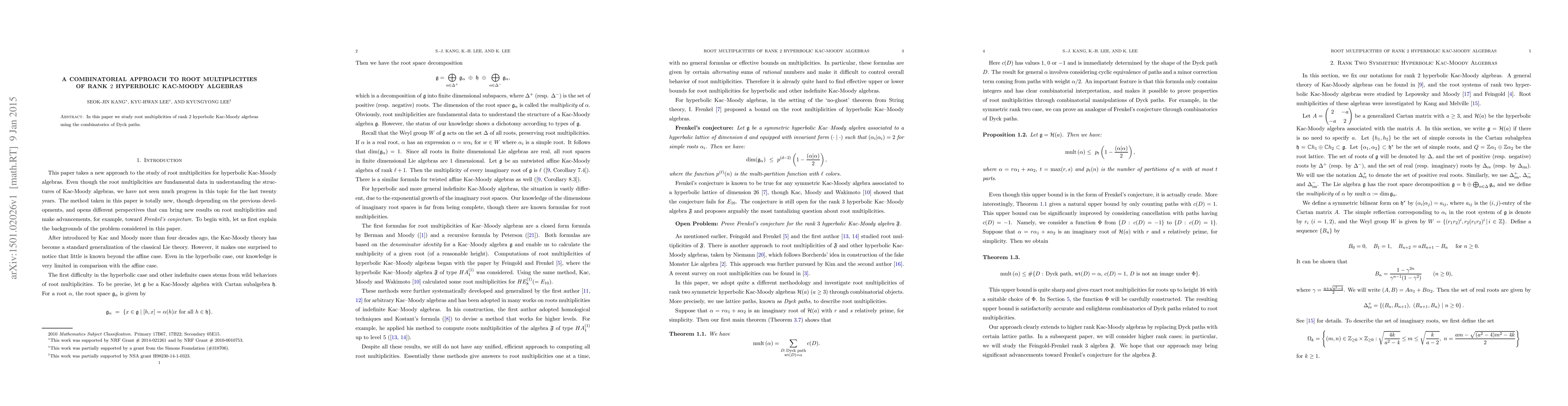 In this paper we study root multiplicities of rank 2 hyperbolic Kac-Moody algebras using the combinatorics of Dyck paths.