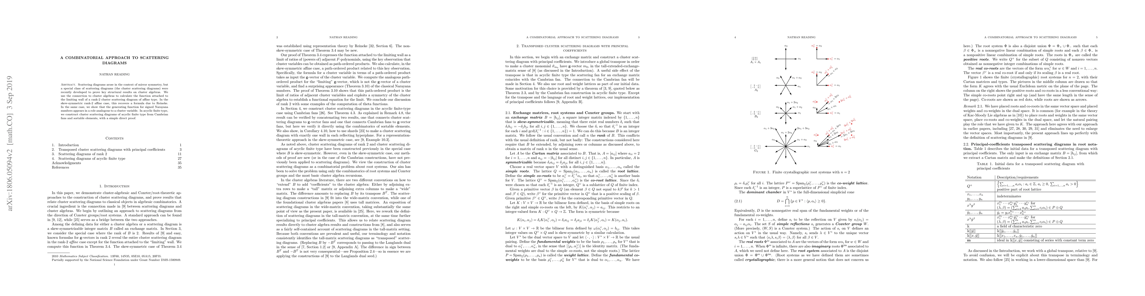 This paper develops a combinatorial approach to scattering diagrams, particularly focusing on cluster scattering diagrams, to derive structural results for cluster algebras. It recovers Reineke's formula for rank-2 affine scattering diagrams and introduces a generating function for signed Narayana numbers analogous to a cluster variable.
