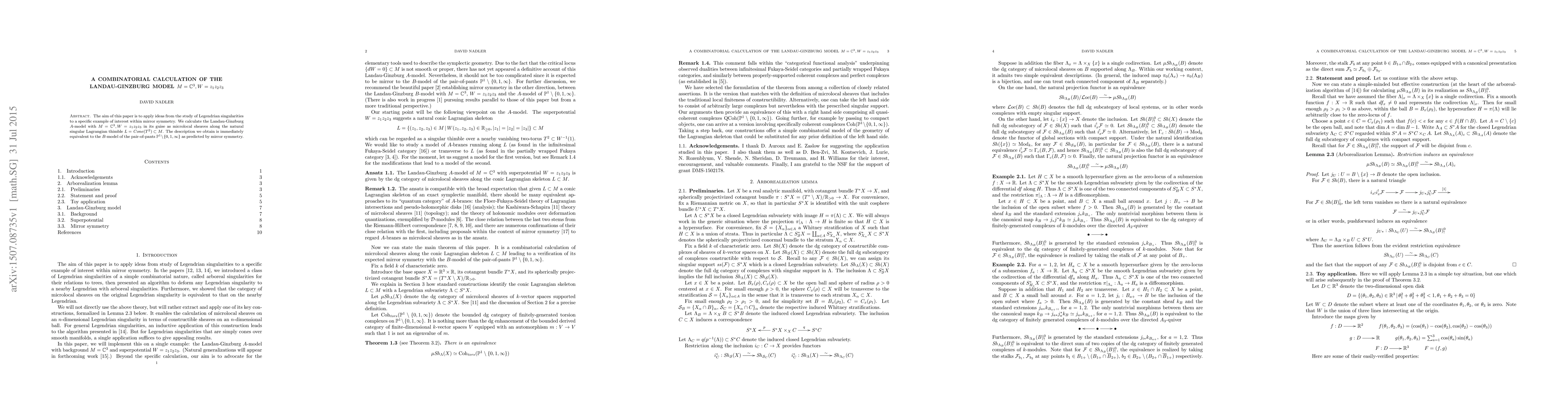 The aim of this paper is to apply ideas from the study of Legendrian singularities to a specific example of interest within mirror symmetry. We calculate the Landau-Ginzburg $A$-model with $M= \mathbb C^3, W=z_1 z_2 z_3$ in its guise as microlocal sheaves along the natural singular Lagrangian thimble $L = {\mathit Cone}(T^2)\subset M$. The description we obtain is immediately equivalent to the $B$-model of the pair-of-pants $\mathbb P^1 \setminus \{0, 1, \infty\}$ as predicted by mirror symmetry.