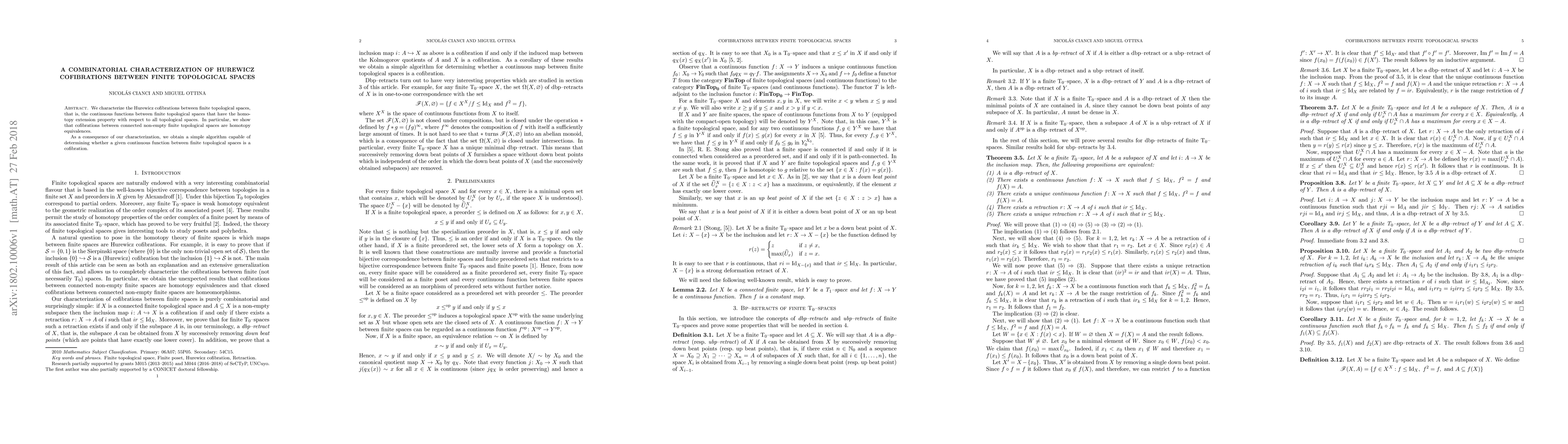 This paper provides a combinatorial characterization of Hurewicz cofibrations between finite topological spaces, proving that such cofibrations between connected non-empty finite spaces are homotopy equivalences. It also presents an algorithm to determine if a given continuous function between such spaces is a cofibration.
