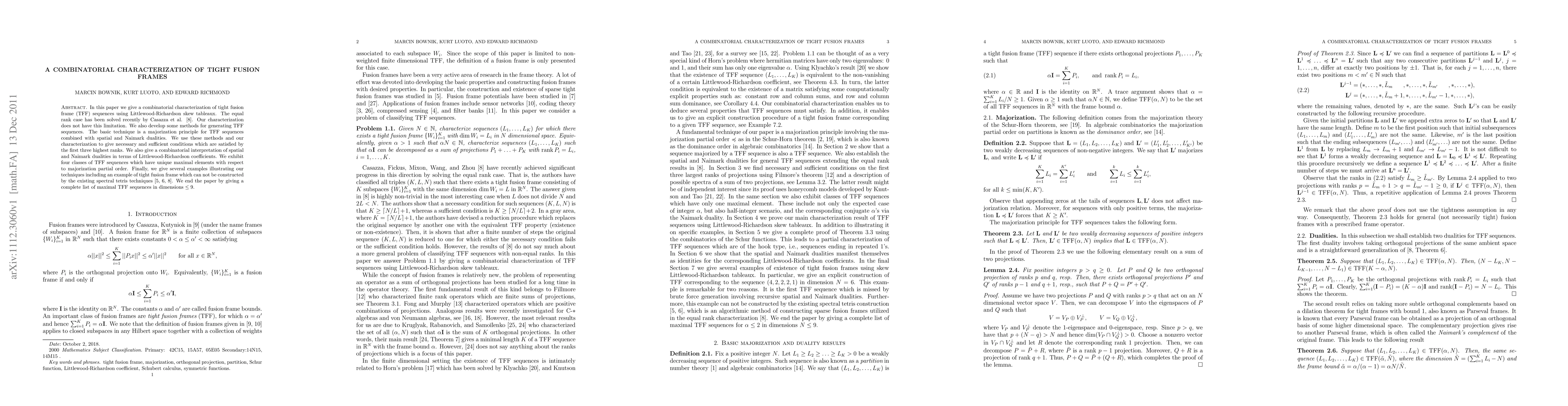 In this paper we give a combinatorial characterization of tight fusion frame (TFF) sequences using Littlewood-Richardson skew tableaux. The equal rank case has been solved recently by Casazza, Fickus, Mixon, Wang, and Zhou. Our characterization does not have this limitation. We also develop some methods for generating TFF sequences. The basic technique is a majorization principle for TFF sequences combined with spatial and Naimark dualities. We use these methods and our characterization to give necessary and sufficient conditions which are satisfied by the first three highest ranks. We also give a combinatorial interpretation of spatial and Naimark dualities in terms of Littlewood-Richardson coefficients. We exhibit four classes of TFF sequences which have unique maximal elements with respect to majorization partial order. Finally, we give several examples illustrating our techniques including an example of tight fusion frame which can not be constructed by the existing spectral tetris techniques. We end the paper by giving a complete list of maximal TFF sequences in dimensions less than ten.