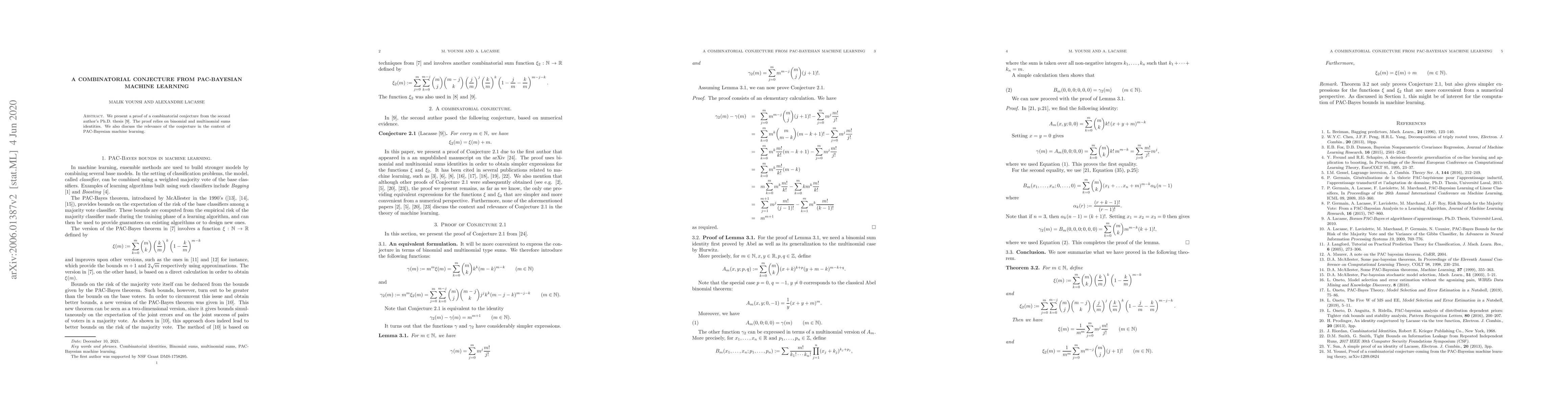 We present a proof of a combinatorial conjecture from the second author's Ph.D. thesis. The proof relies on binomial and multinomial sums identities. We also discuss the relevance of the conjecture in the context of PAC-Bayesian machine learning.