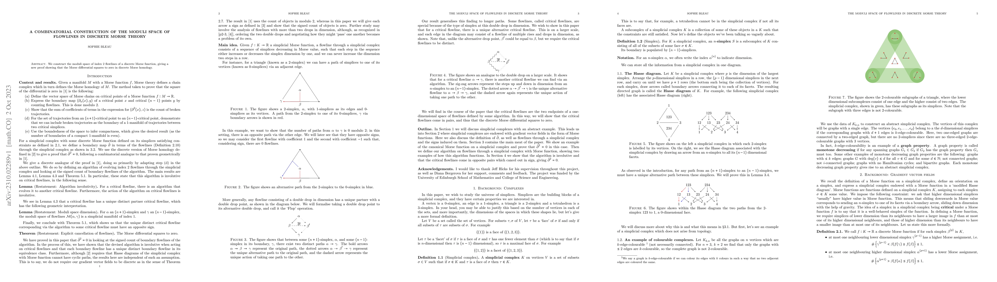 Summary: This paper introduces a combinatorial method to construct the moduli space of index 2 flowlines in discrete Morse theory, providing a novel proof that the Morse differential squares to zero in discrete Morse homology.