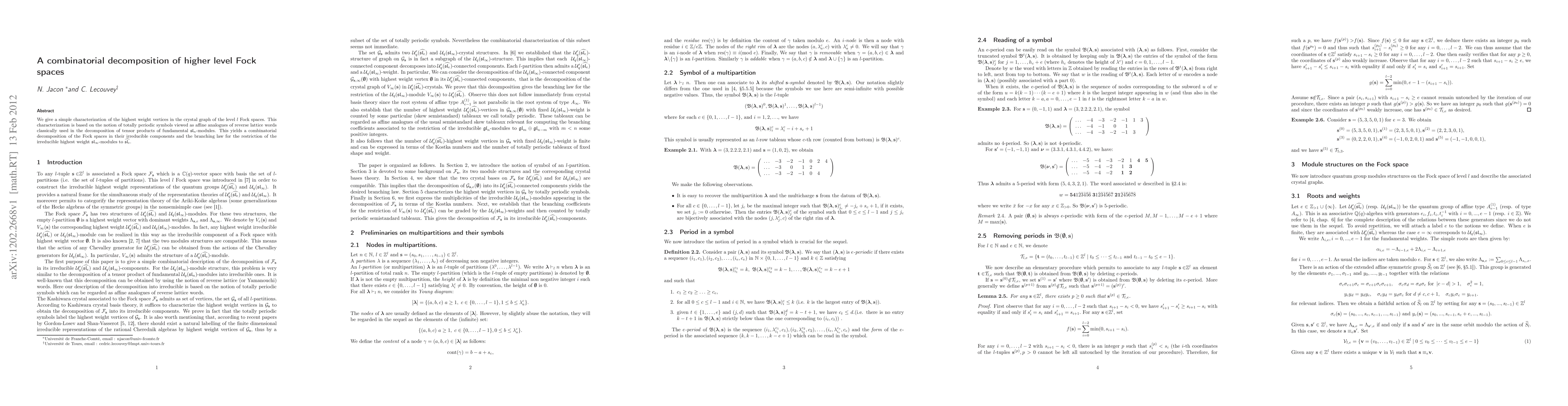 We give a simple characterization of the highest weight vertices in the crystal graph of the level l Fock spaces. This characterization is based on the notion of totally periodic symbols viewed as affine analogues of reverse lattice words classically used in the decomposition of tensor products of fundamental $\mathfrak{sl}_{n}$-modules. This yields a combinatorial decomposition of the Fock spaces in their irreducible components and the branching law for the restriction of the irreducible highest weight $\mathfrak{sl}_{\infty}$-modules to $\hat{\mathfrak{sl}_{e}}$.