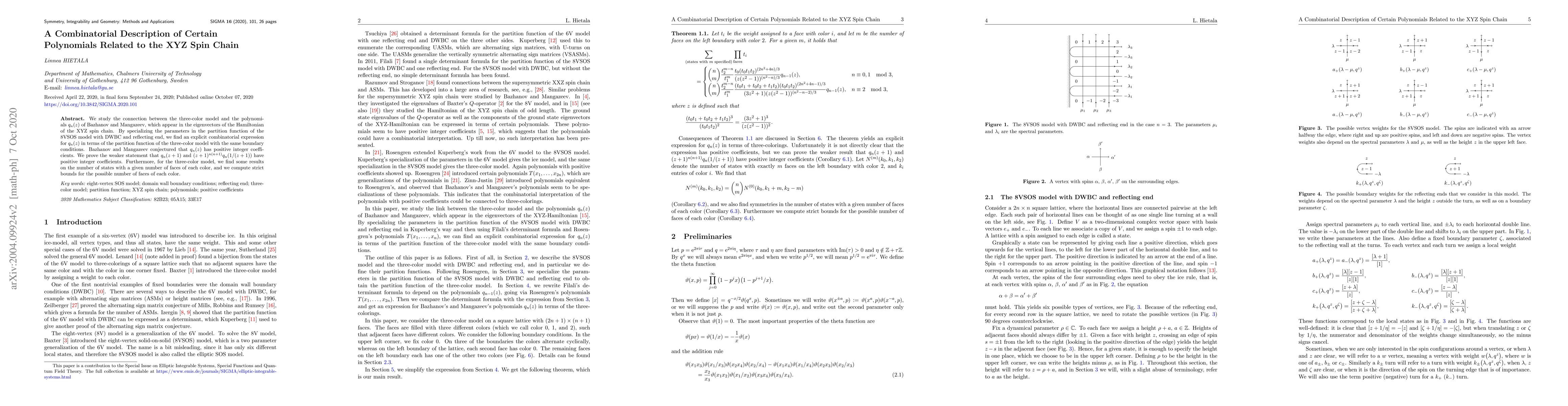 Researchers found an explicit combinatorial expression for polynomials related to the XYZ spin chain, proving that certain coefficients are positive integers, and providing insights into the number of states with different face colorings.