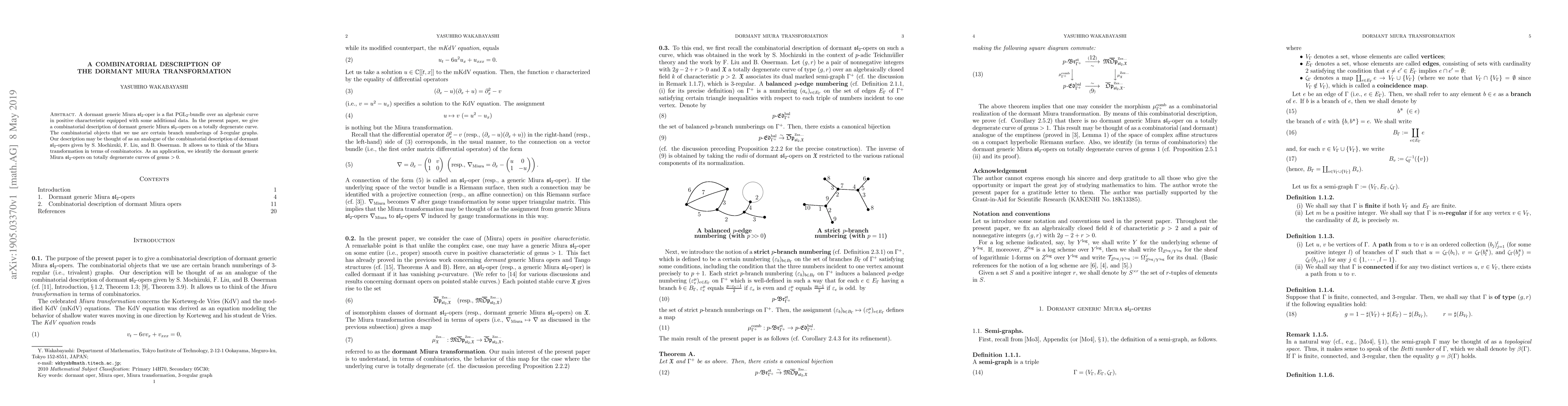 A dormant generic Miura $\mathfrak{sl}_2$-oper is a flat $\mathrm{PGL}_2$-bundle over an algebraic curve in positive characteristic equipped with some additional data. In the present paper, we give a combinatorial description of dormant generic Miura $\mathfrak{sl}_2$-opers on a totally degenerate curve. The combinatorial objects that we use are certain branch numberings of $3$-regular graphs. Our description may be thought of as an analogue of the combinatorial description of dormant $\mathfrak{sl}_2$-opers given by S. Mochizuki, F. Liu, and B. Osserman. It allows us to think of the Miura transformation in terms of combinatorics. As an application, we identify the dormant generic Miura $\mathfrak{sl}_2$-opers on totally degenerate curves of genus $>0$.