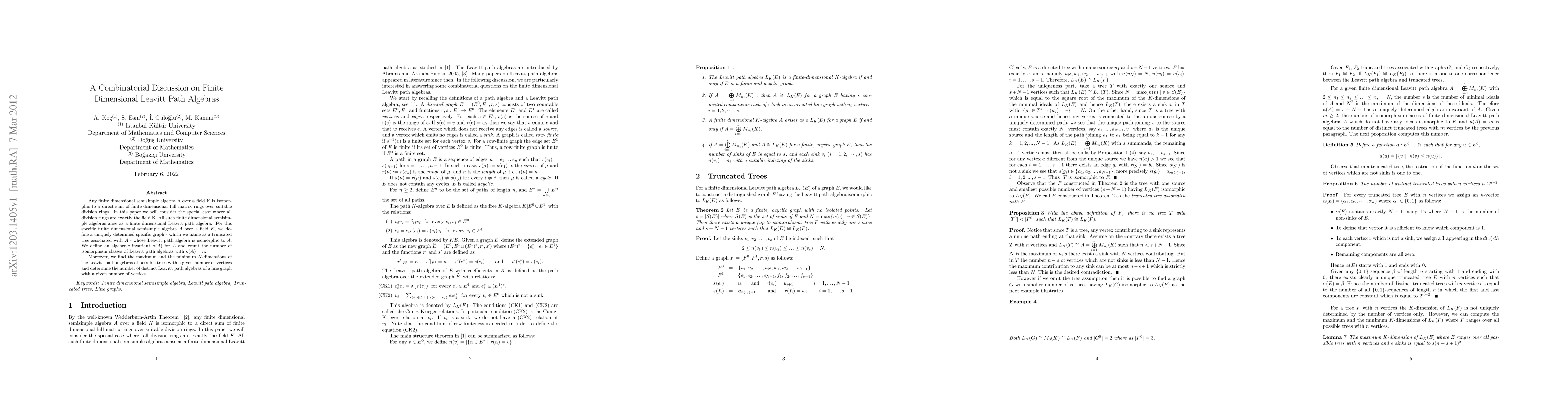 Any finite dimensional semisimple algebra A over a field K is isomorphic to a direct sum of finite dimensional full matrix rings over suitable division rings. In this paper we will consider the special case where all division rings are exactly the field K. All such finite dimensional semisimple algebras arise as a finite dimensional Leavitt path algebra. For this specific finite dimensional semisimple algebra A over a field K, we define a uniquely detemined specific graph - which we name as a truncated tree associated with A - whose Leavitt path algebra is isomorphic to A. We define an algebraic invariant {\kappa}(A) for A and count the number of isomorphism classes of Leavitt path algebras with {\kappa}(A)=n. Moreover, we find the maximum and the minimum K-dimensions of the Leavitt path algebras of possible trees with a given number of vertices and determine the number of distinct Leavitt path algebras of a line graph with a given number of vertices.