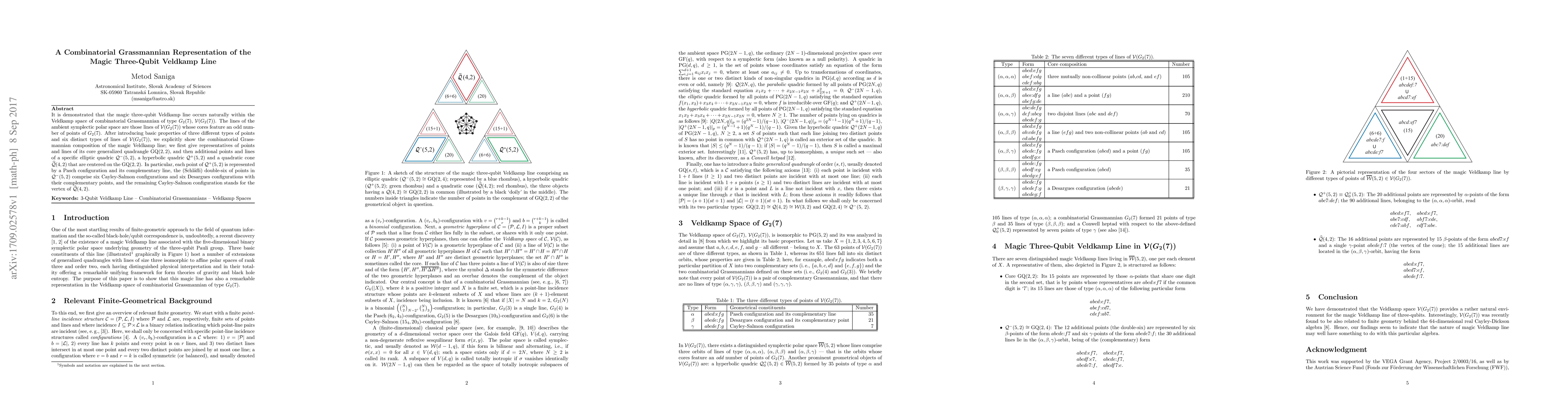 This paper demonstrates the natural occurrence of the magic three-qubit Veldkamp line within the combinatorial Grassmannian $G_2(7)$. It details the composition of this line through representatives of points and lines from its core generalized quadrangle GQ$(2,2)$ and additional structures from specific elliptic and hyperbolic quadrics.