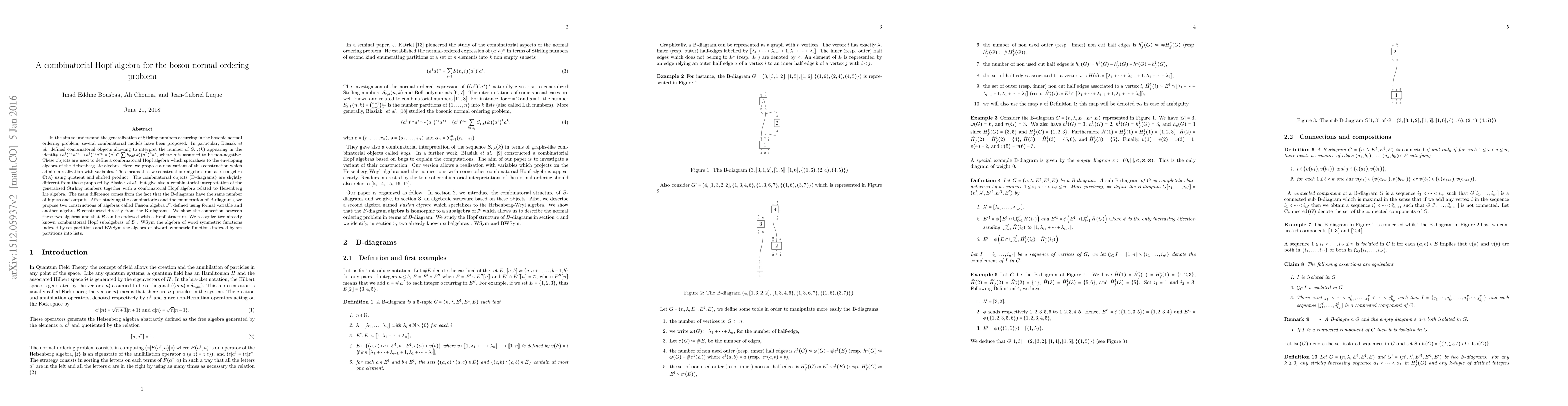 In the aim to understand the generalization of Stirling numbers occurring in the bosonic normal ordering problem, several combinatorial models have been proposed. In particular, Blasiak \emph{et al.} defined combinatorial objects allowing to interpret the number of $S_{\bf{r,s}}(k)$ appearing in the identity $(a^\dag)^{r_n}a^{s_n}\cdots(a^\dag)^{r_1}a^{s_1}=(a^\dag)^\alpha\displaystyle\sum S_{\bf{r,s}}(k)(a^\dag)^k a^k$, where $\alpha$ is assumed to be non-negative. These objects are used to define a combinatorial Hopf algebra which specializes to the enveloping algebra of the Heisenberg Lie algebra. Here, we propose a new variant of this construction which admits a realization with variables. This means that we construct our algebra from a free algebra $\mathbb{C}\langle A \rangle$ using quotient and shifted product. The combinatorial objects (B-diagrams) are slightly different from those proposed by Blasiak \emph{et al.}, but give also a combinatorial interpretation of the generalized Stirling numbers together with a combinatorial Hopf algebra related to Heisenberg Lie algebra. The main difference comes from the fact that the B-diagrams have the same number of inputs and outputs. After studying the combinatorics and the enumeration of B-diagrams, we propose two constructions of algebras called Fusion algebra $\mathcal{F}$, defined using formal variable and another algebra $\mathcal{B}$ constructed directly from the B-diagrams. We show the connection between these two algebras and that $\mathcal{B}$ can be endowed with a Hopf structure. We recognize two already known combinatorial Hopf subalgebras of $\mathcal{B}$ : $\mathrm{WSym}$ the algebra of word symmetric functions indexed by set partitions and $\mathrm{BWSym}$ the algebra of biword symmetric functions indexed by set partitions into lists.