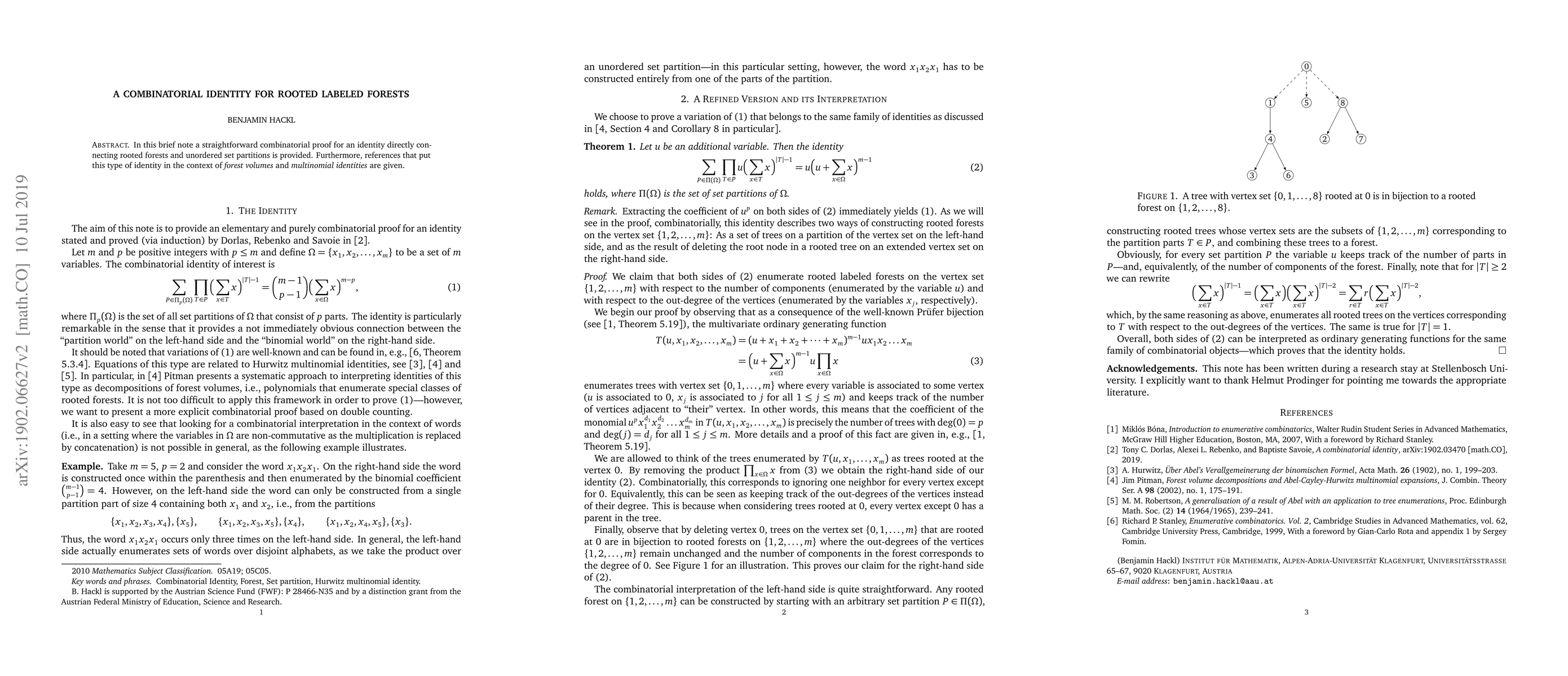 This paper presents a combinatorial proof linking rooted labeled forests with unordered set partitions, and situates this identity within the context of forest volumes and multinomial identities. The work provides a clear connection between these combinatorial structures.