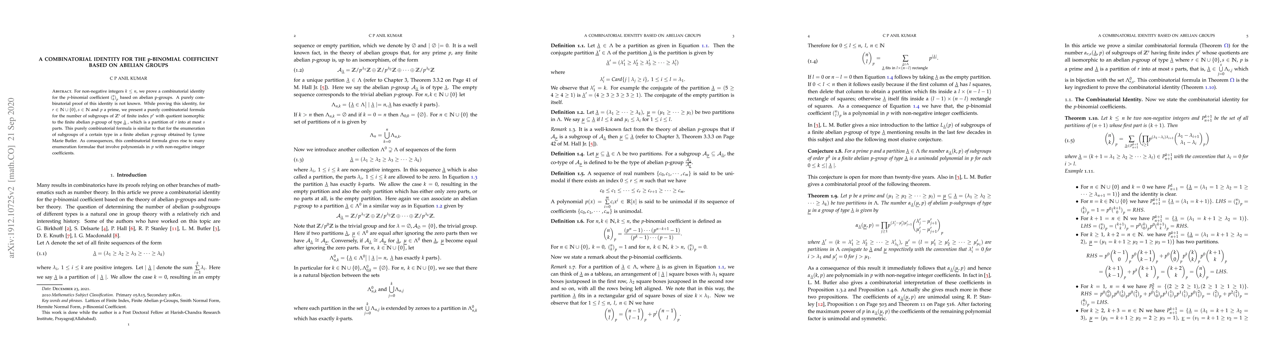 This paper proves a combinatorial identity for $p$-binomial coefficients $\binom{n}{k}_p$ using abelian $p$-groups, and presents a purely combinatorial formula for the number of subgroups of $\mathbb{Z}^s$ of finite index $p^r$ with specified quotient structure. The results yield numerous enumeration formulae involving polynomials in $p$.