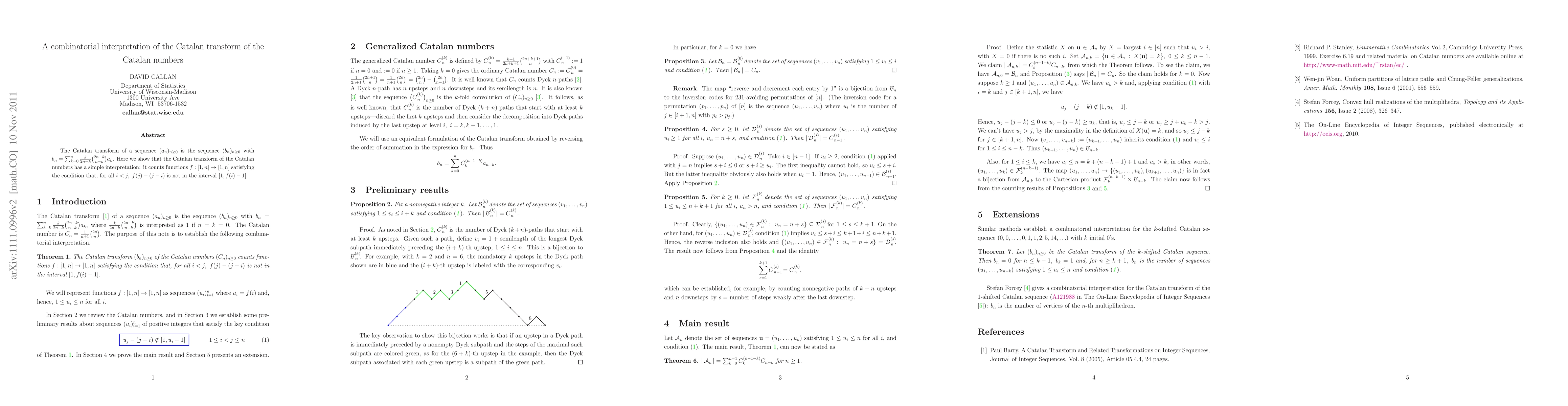 Title: A combinatorial interpretation of the Catalan transform of the Catalan numbers Summary: The paper demonstrates that the Catalan transform of the Catalan numbers counts functions from [1,n] to [1,n] where, for all i < j, f(j) - (j-i) does not fall within the interval [1, f(i)-1]. This provides a combinatorial interpretation of the transform.