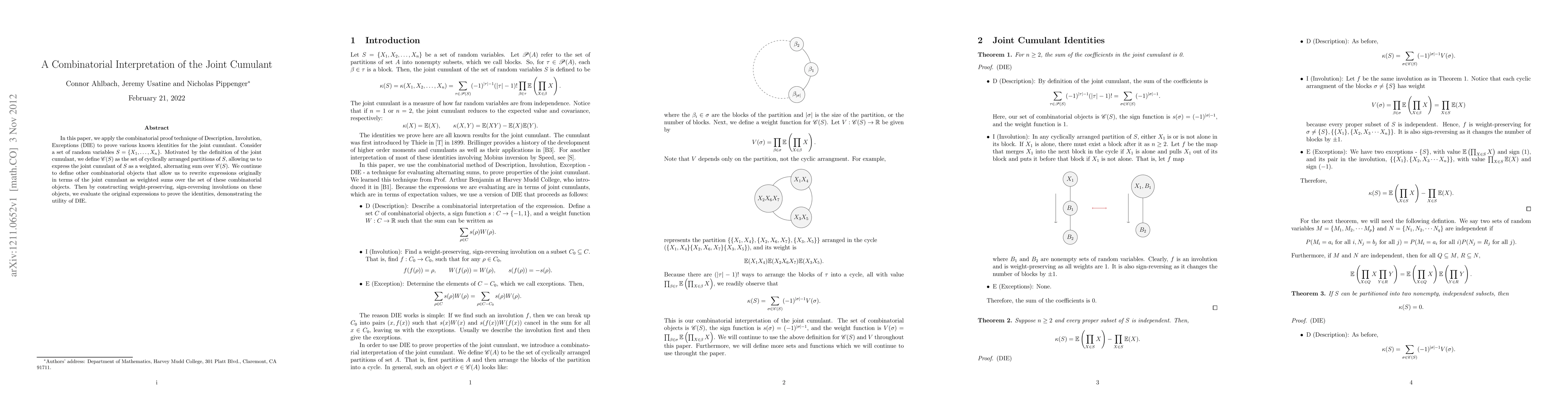 In this paper, we apply the combinatorial proof technique of Description, Involution, Exceptions (DIE) to prove various known identities for the joint cumulant. Consider a set of random variables $S = \{X_1,..., X_n\} $. Motivated by the definition of the joint cumulant, we define $ \sC(S) $ as the set of cyclically arranged partitions of $S$, allowing us to express the joint cumulant of $ S $ as a weighted, alternating sum over $\sC(S)$. We continue to define other combinatorial objects that allow us to rewrite expressions originally in terms of the joint cumulant as weighted sums over the set of these combinatorial objects. Then by constructing weight-preserving, sign-reversing involutions on these objects, we evaluate the original expressions to prove the identities, demonstrating the utility of DIE.