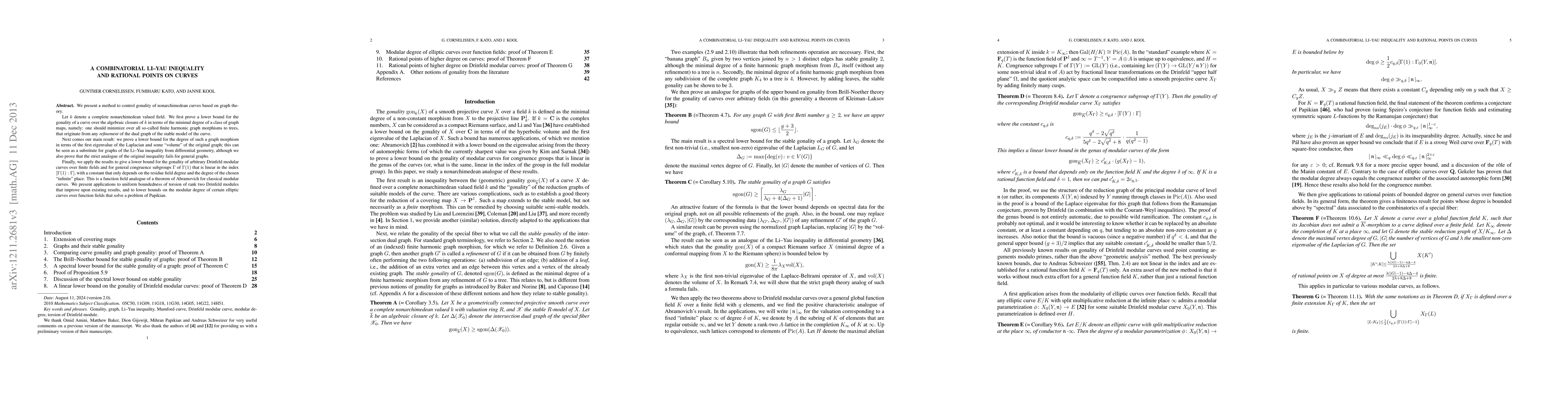 We present a method to control gonality of nonarchimedean curves based on graph theory. Let k denote a complete nonarchimedean valued field. We first prove a lower bound for the gonality of a curve over the algebraic closure of k in terms of the minimal degree of a class of graph maps, namely: one should minimize over all so-called finite harmonic graph morphisms to trees, that originate from any refinement of the dual graph of the stable model of the curve. Next comes our main result: we prove a lower bound for the degree of such a graph morphism in terms of the first eigenvalue of the Laplacian and some "volume" of the original graph; this can be seen as a substitute for graphs of the Li-Yau inequality from differential geometry, although we also prove that the strict analogue of the original inequality fails for general graphs. Finally, we apply the results to give a lower bound for the gonality of arbitrary Drinfeld modular curves over finite fields and for general congruence subgroups Gamma of Gamma(1) that is linear in the index [Gamma(1):Gamma], with a constant that only depends on the residue field degree and the degree of the chosen "infinite" place. This is a function field analogue of a theorem of Abramovich for classical modular curves. We present applications to uniform boundedness of torsion of rank two Drinfeld modules that improve upon existing results, and to lower bounds on the modular degree of certain elliptic curves over function fields that solve a problem of Papikian.