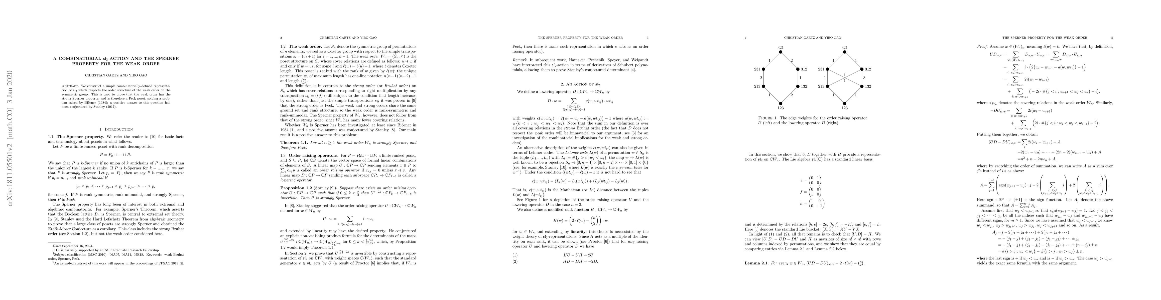 Researchers develop a combinatorial representation of the Lie algebra $rak{sl}_2$ that respects the weak order structure of the symmetric group, resolving a conjecture on the Sperner property and confirming it as a Peck poset.