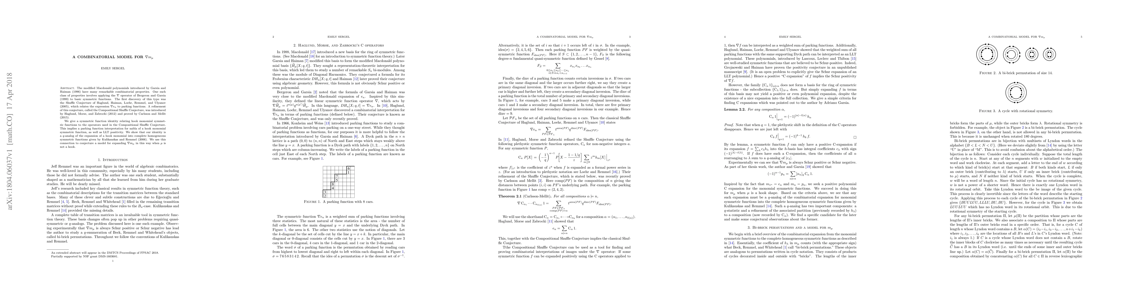 This paper introduces a combinatorial model for $\nabla m_\mu$, exploring symmetric function identities involving hook monomials and the $\nabla$ operator. It establishes a parking function interpretation for $\nabla$ applied to hook monomial symmetric functions, extending previous results and conjectures a broader model for non-hook $\mu$.