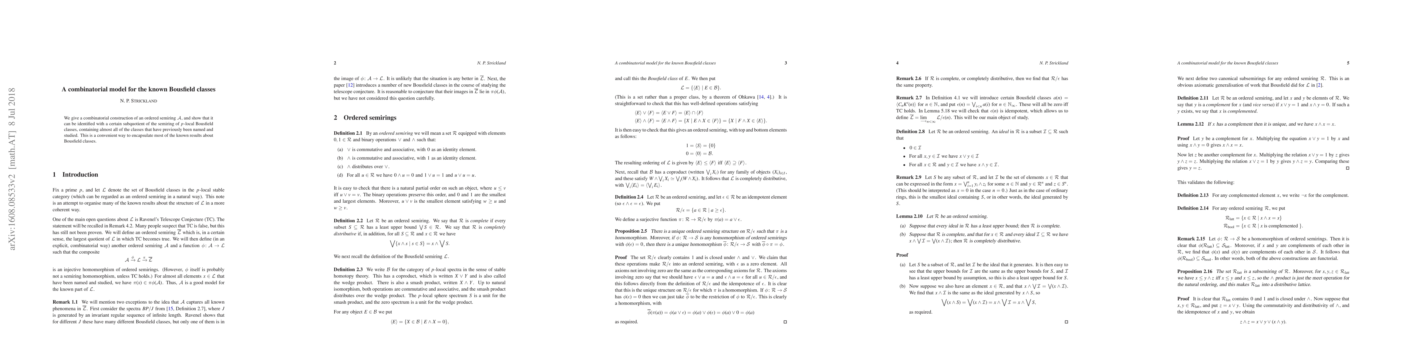 We give a combinatorial construction of an ordered semiring A, and show that it can be identified with a certain subquotient of the semiring of p-local Bousfield classes, containing almost all of the classes that have previously been named and studied. This is a convenient way to encapsulate most of the known results about Bousfield classes.