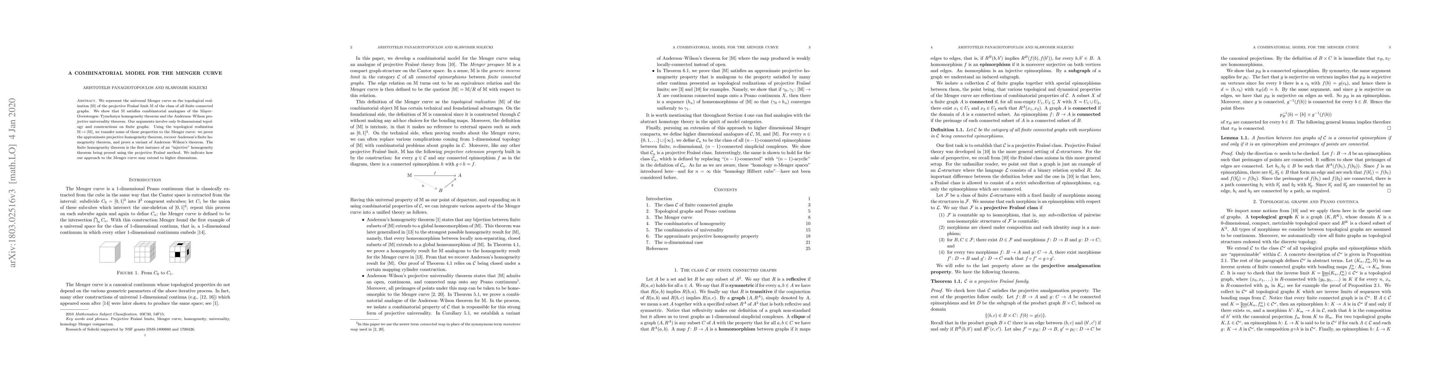 We represent the universal Menger curve as the topological realization $|\mathbb{M}|$ of the projective Fra\"iss\'e limit ${\mathbb M}$ of the class of all finite connected graphs. We show that $\mathbb{M}$ satisfies combinatorial analogues of the Mayer-Oversteegen-Tymchatyn homogeneity theorem and the Anderson-Wilson projective universality theorem. Our arguments involve only $0$-dimensional topology and constructions on finite graphs. Using the topological realization $\mathbb{M}\mapsto|\mathbb{M}|$, we transfer some of these properties to the Menger curve: we prove the approximate projective homogeneity theorem, recover Anderson's finite homogeneity theorem, and prove a variant of Anderson-Wilson's theorem. The finite homogeneity theorem is the first instance of an "injective" homogeneity theorem being proved using the projective Fra\"iss\'e method. We indicate how our approach to the Menger curve may extend to higher dimensions.