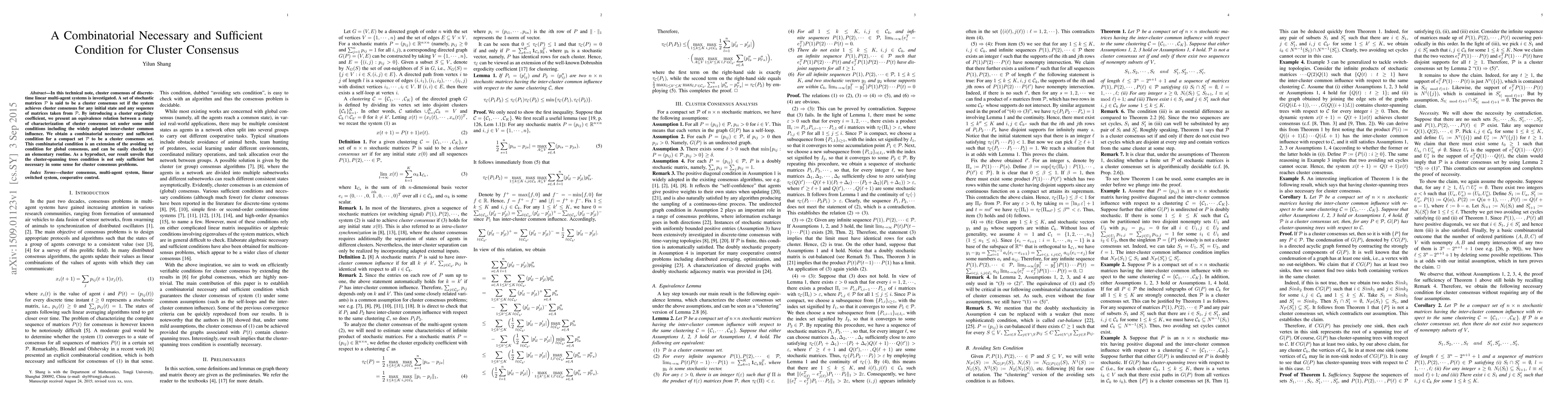 This paper presents a combinatorial necessary and sufficient condition for cluster consensus in discrete-time linear multi-agent systems, extending the avoiding set condition for global consensus. It also reveals that the cluster-spanning trees condition is both necessary and sufficient for achieving cluster consensus.