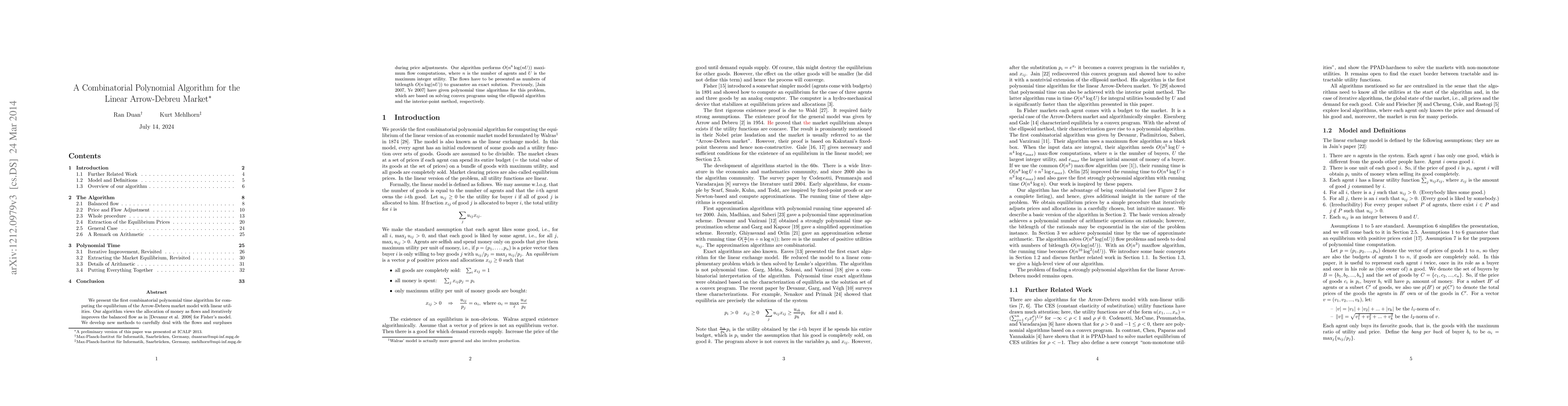Summary: This paper introduces a novel combinatorial polynomial time algorithm to determine the equilibrium prices in the Arrow-Debreu market model, which features linear utilities, marking a significant advancement in computational economics.