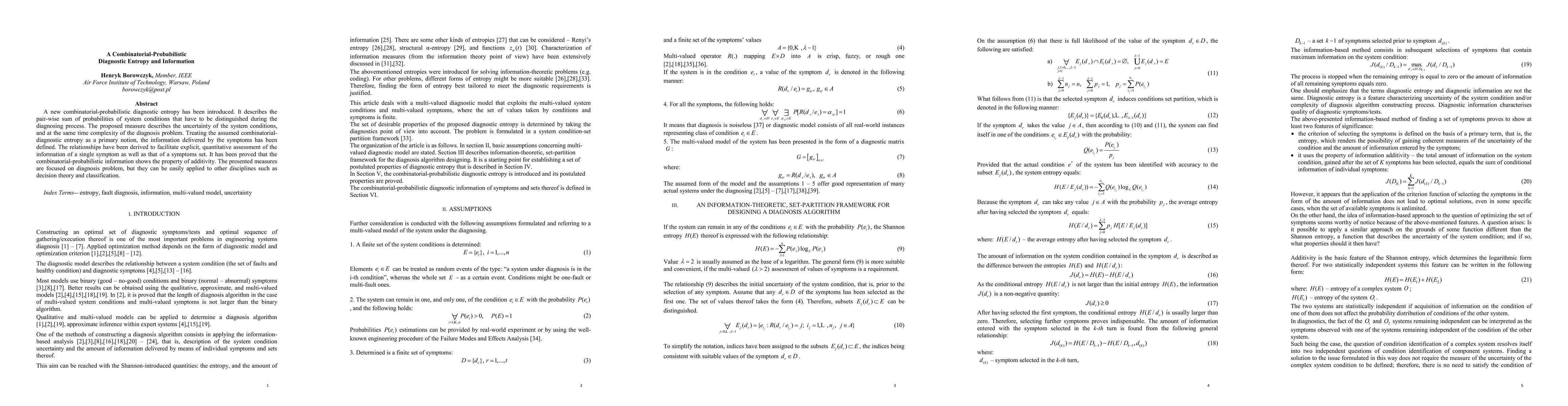 This paper introduces a new combinatorial-probabilistic diagnostic entropy to quantify the uncertainty and complexity in diagnosing system conditions. It also defines the information delivered by symptoms, proving the additivity property, and extends its applicability beyond diagnosis to fields like decision theory and classification.
