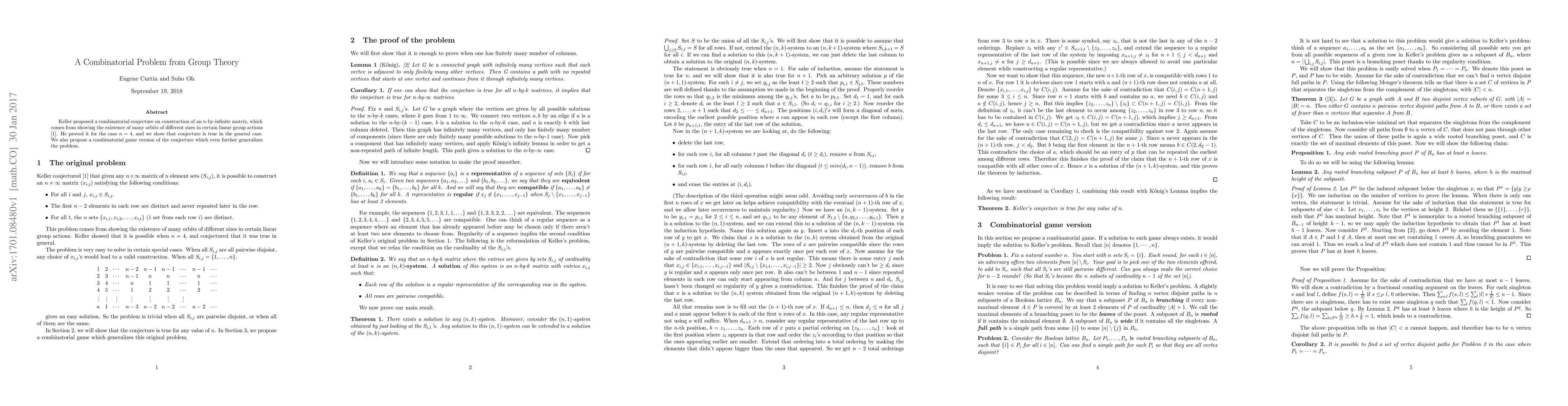 Researchers prove a combinatorial conjecture about constructing an n-by-infinite matrix from group theory, generalizing it from the case of n=4, and propose a new game version that further broadens the problem.
