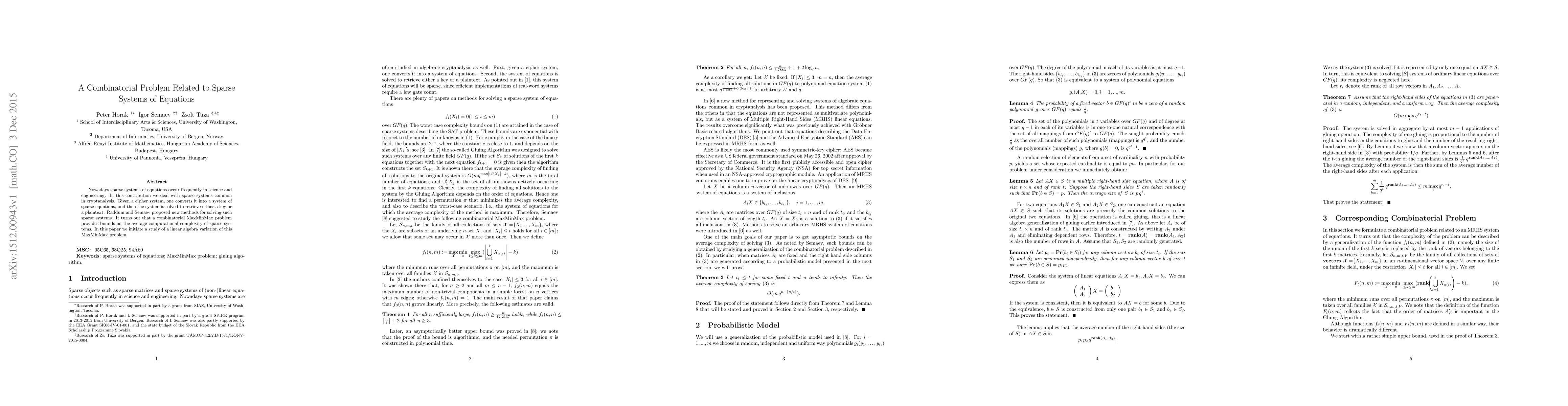 Nowadays sparse systems of equations occur frequently in science and engineering. In this contribution we deal with sparse systems common in cryptanalysis. Given a cipher system, one converts it into a system of sparse equations, and then the system is solved to retrieve either a key or a plaintext. Raddum and Semaev proposed new methods for solving such sparse systems. It turns out that a combinatorial MaxMinMax problem provides bounds on the average computational complexity of sparse systems. In this paper we initiate a study of a linear algebra variation of this MaxMinMax problem.