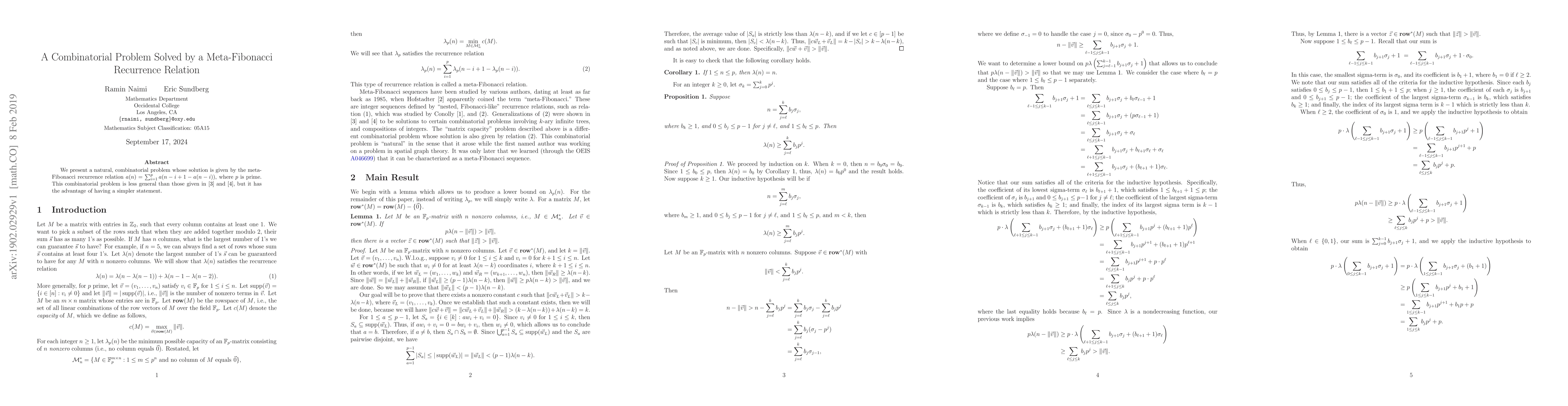 This paper introduces a combinatorial problem solved using a meta-Fibonacci recurrence relation, simpler than those in previous works, offering a novel approach to such problems.